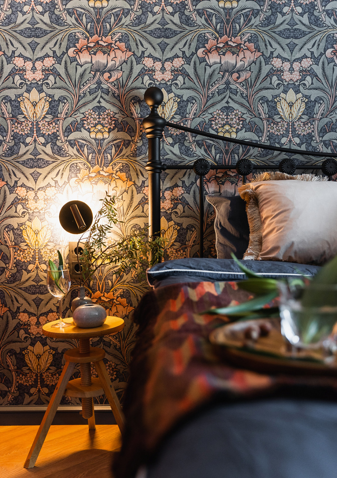 Еще из интересных особенностей – в квартире есть «бирюзовый кубик». Первый и основной цветовой акцент зоны прихожей, гостиной и кухни – это П-образный участок квартиры, выкрашенный в сложный бирюзовый цвет. Одним из ярких и притягательных элементов, которые команда Лауры добавила в комнатах, стали обои. Интересно, что отрез от обоев задекорировали и использовали в качестве картины в гостиной. Также в этом салоне подобрали шторы для проекта. Пространство дизайнер обыграла с помощью света.