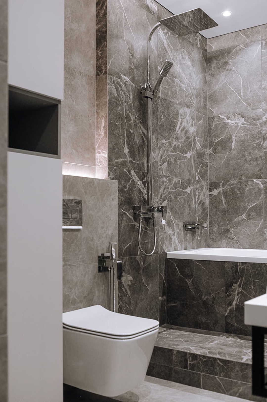 Интересной задачей стало желание заказчика уместить ванную и душевую. Мы решили сыграть на зонировании и отделили «мокрую зону», объединив ванну и душевую в один объем. Также зоны делятся по полу, с помощью подиума душевой и смещения потолка по высоте, границу которой держит световая линия. Прихожая выполнена в нейтральном сером оттенке. Скрытые двери окрашены в цвет стен: такой прием делает пространство еще более чистым и легким.
