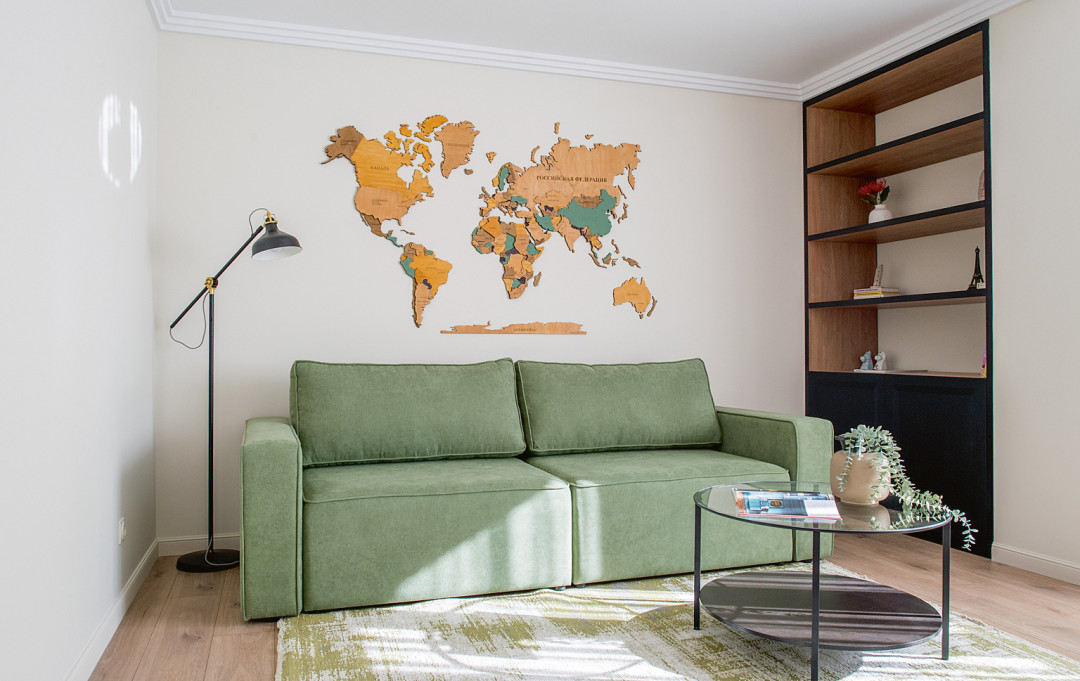 Карта мира на стене – ручная работа: ее сделали на заказ в цветовой гамме нашего интерьера. Клиент хотел, чтобы ламинат в доме был натурального оттенка, без желтизны. Нам удалось найти идеальный вариант. В помещениях предусмотрены разные сценарии освещения. Черные бра и люстры рифмуются с графичными линиями в интерьере и создают красивый теневой рисунок на стенах. Помещения выполнены в едином цветовом решении – это тоже зрительно увеличивает площадь.