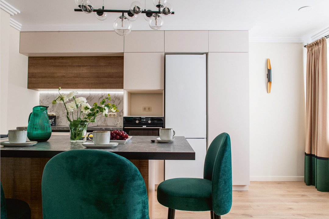 Изначально в стене на кухне было сделано две ниши: такое решение от застройщика показалось нам неудобным в эксплуатации. Чтобы не терять площадь, мы решили не зашивать их гипсокартоном. Вместо этого установили гарнитур перпендикулярно стене, а вместо обеденного стола поставили остров. Барные стулья сделали на заказ: они идеально вписались по всем параметрам.