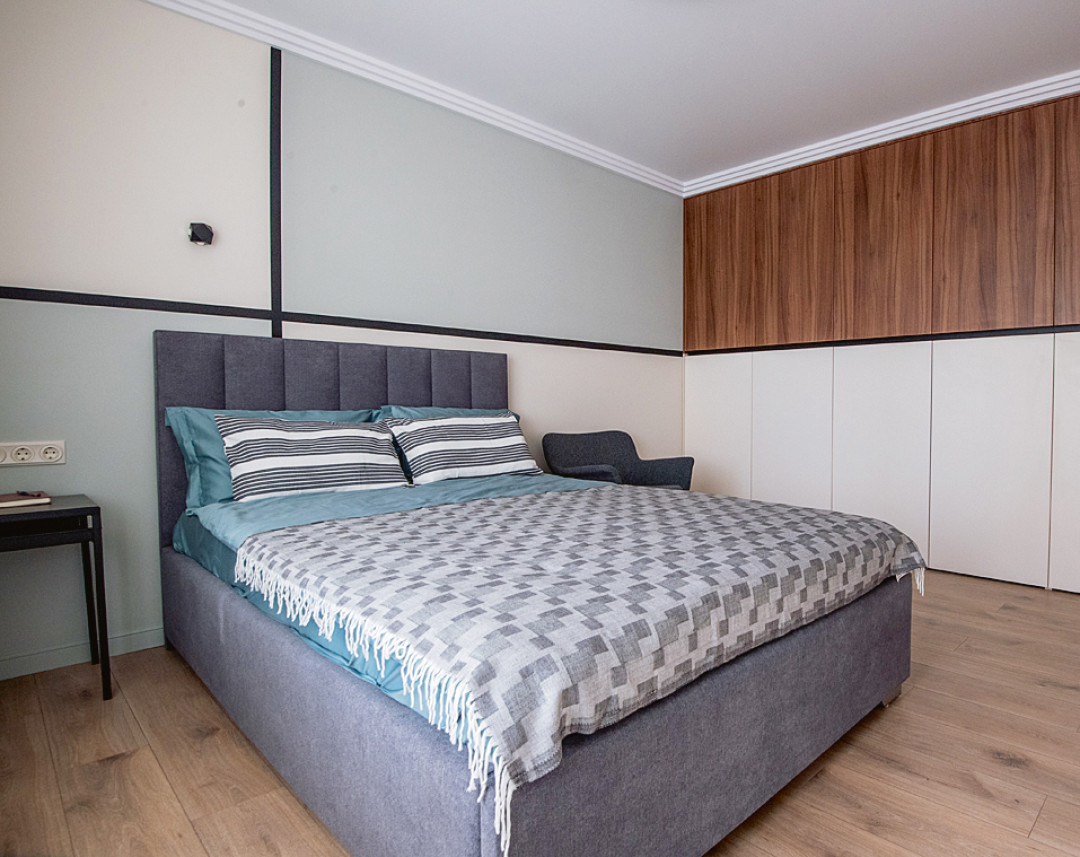 Спальню мы полностью отвели под зону отдыха. Здесь же установили систему хранения: четырехметровый шкаф вмещает все необходимое и при этом не бросается в глаза.