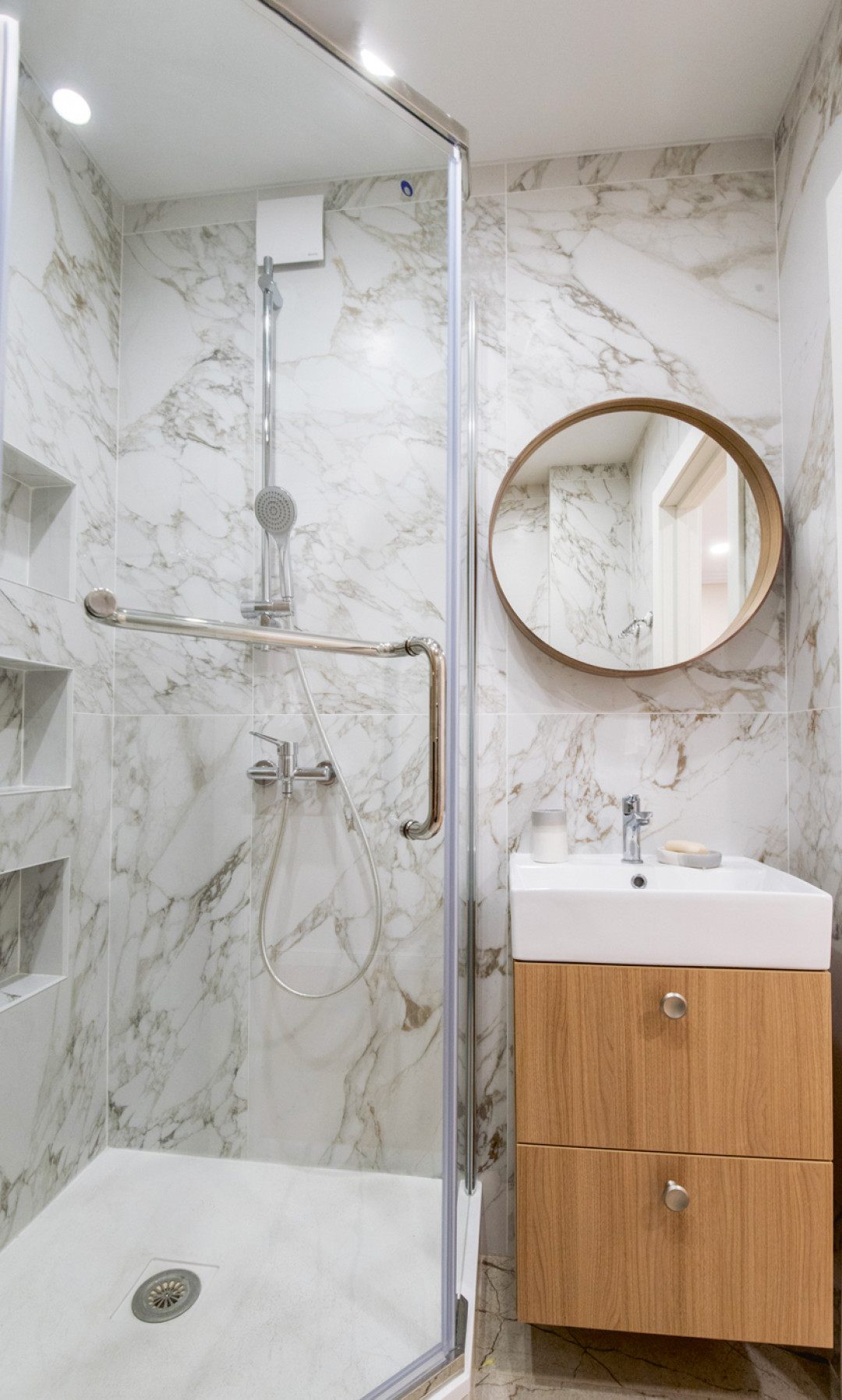 Ванну по просьбе заказчика мы заменили душевой кабиной. Для отделки санузла использовали крупноформатный керамогранит под камень: он визуально расширил пространство. Всю сантехнику приобрели в одном салоне. Мебель в квартире, в том числе в ванной, выполнена по моим чертежам на фабрике.