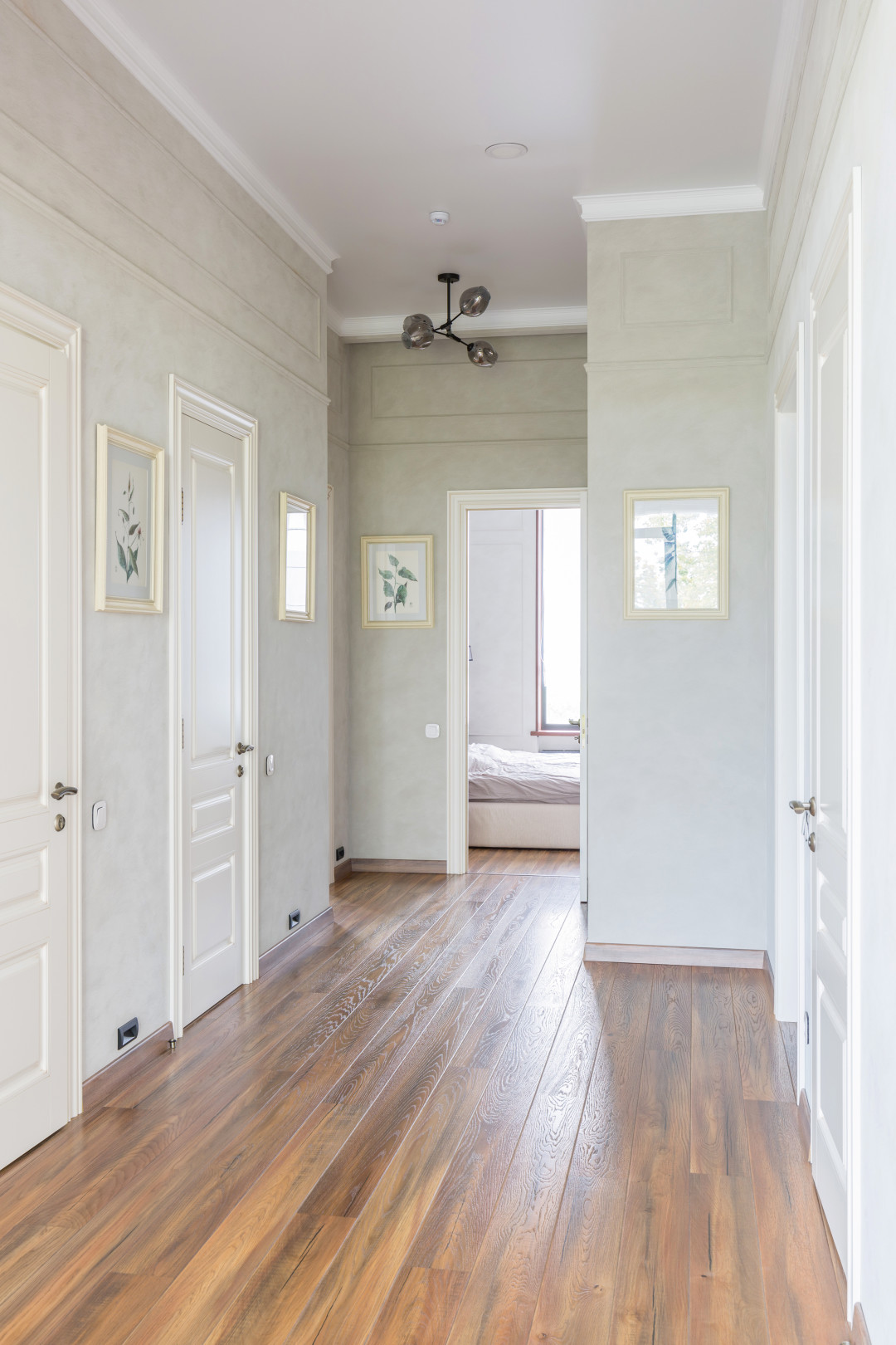 Интерьер выполнили в строгом неоклассическом стиле в мягких тонах без резких контрастных решений в отделке