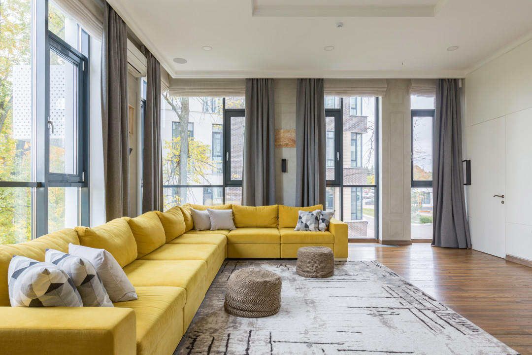 Интерьер выполнили в строгом неоклассическом стиле в мягких тонах без резких контрастных решений в отделке. «Гегемоном» в цветовой палитре гостиной стал угловой диван в ткани сложного горчичного цвета. В отделке применили натуральные экологичные и износостойкие материалы, реализовали несколько сценариев света. В декорациях – живые цветы и авторские картины известных башкирских художников и керамистов: Бориса Домашникова, Залифы Хибатовой, Лианы Ни, Елены Мали, Марины Таран, Моисея Гульченко.