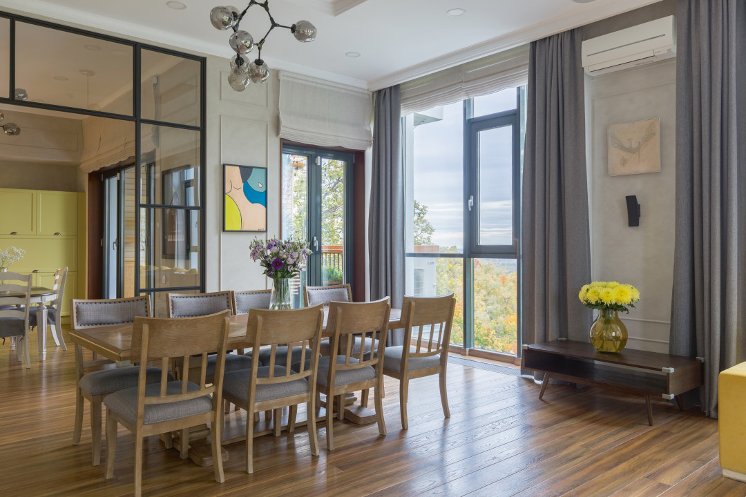 На проектирование и реализацию нам досталась квартира площадью 220 кв.м с террасой, большими витражами, высоким потолком (3,6 м!) и отличным видом на реку. Заказчики поставили задачу создать уютную и функциональную квартиру для семьи из пяти человек.