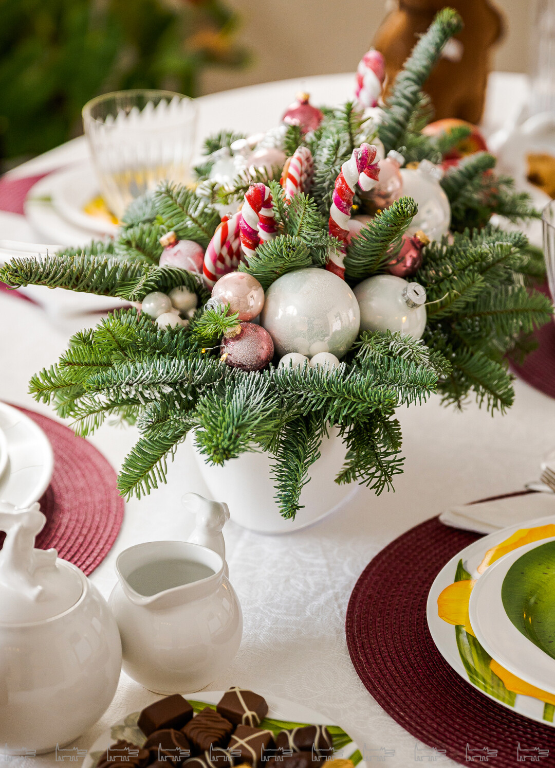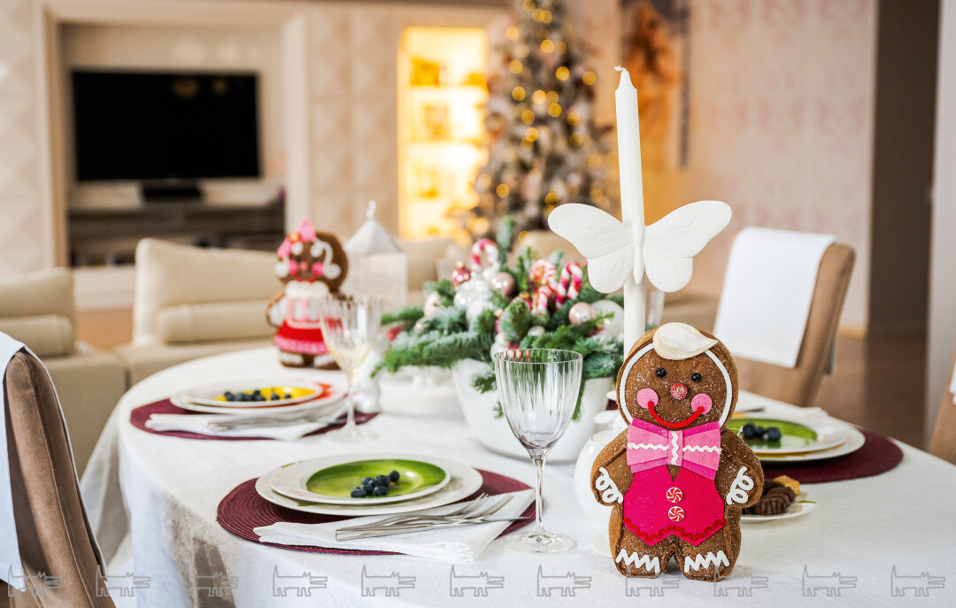 В этом году я решила посуду с традиционным рождественским оформлением оставить для загородного дома, а для городской квартиры выбрать тематику сладостей. Поэтому весь стол – в леденцах, конфетах, фруктах и имбирных пряниках. Получилось необычно, но, по-моему, очень нарядно!