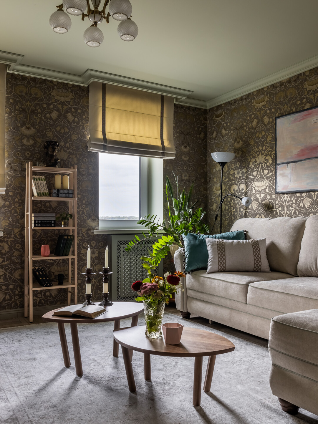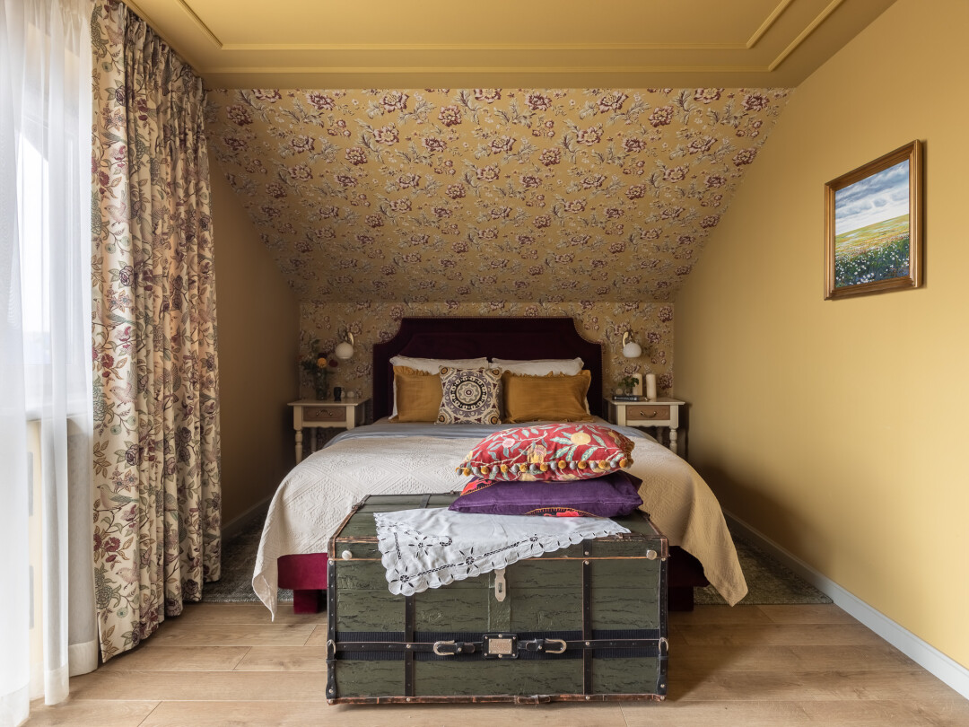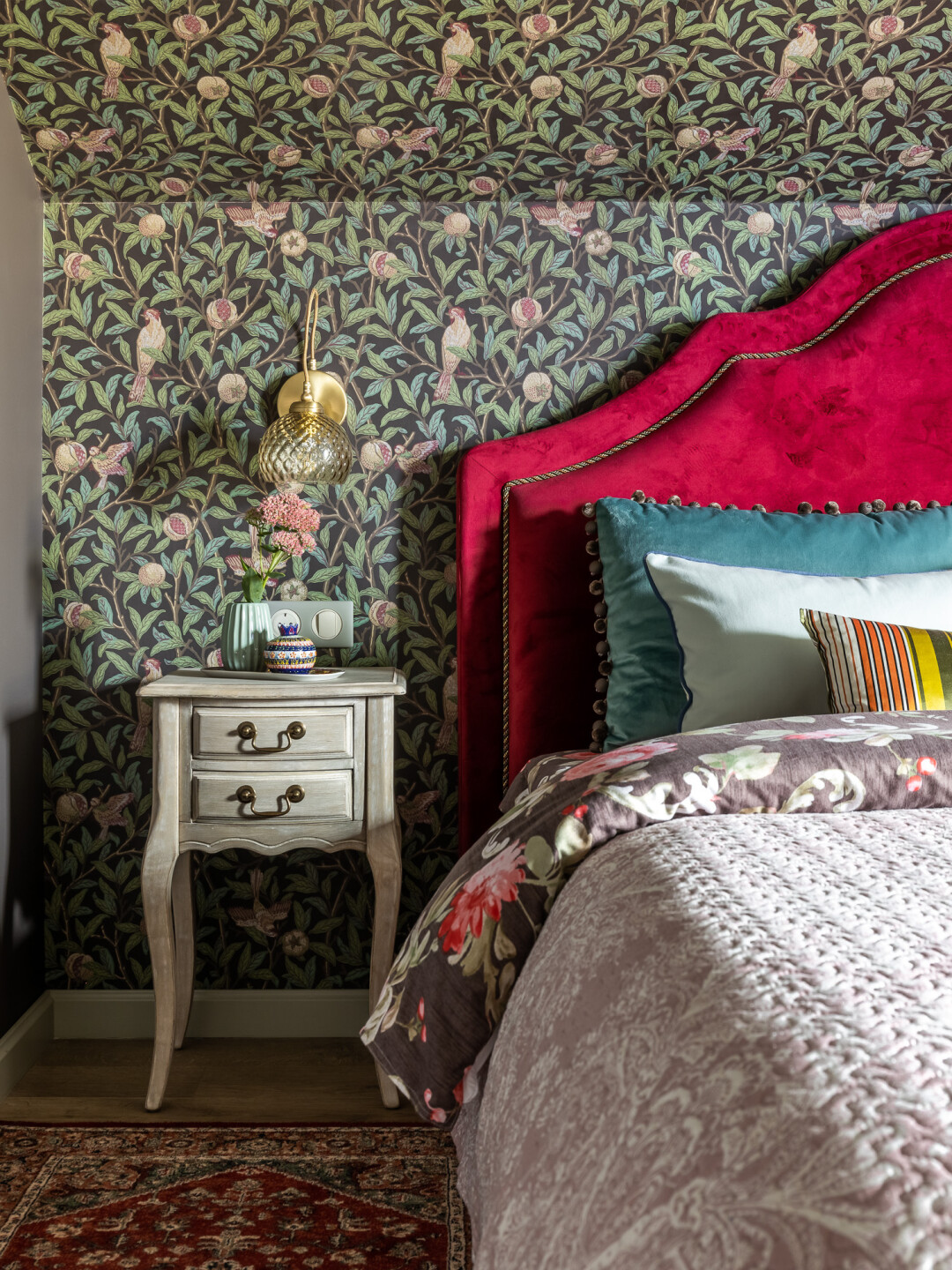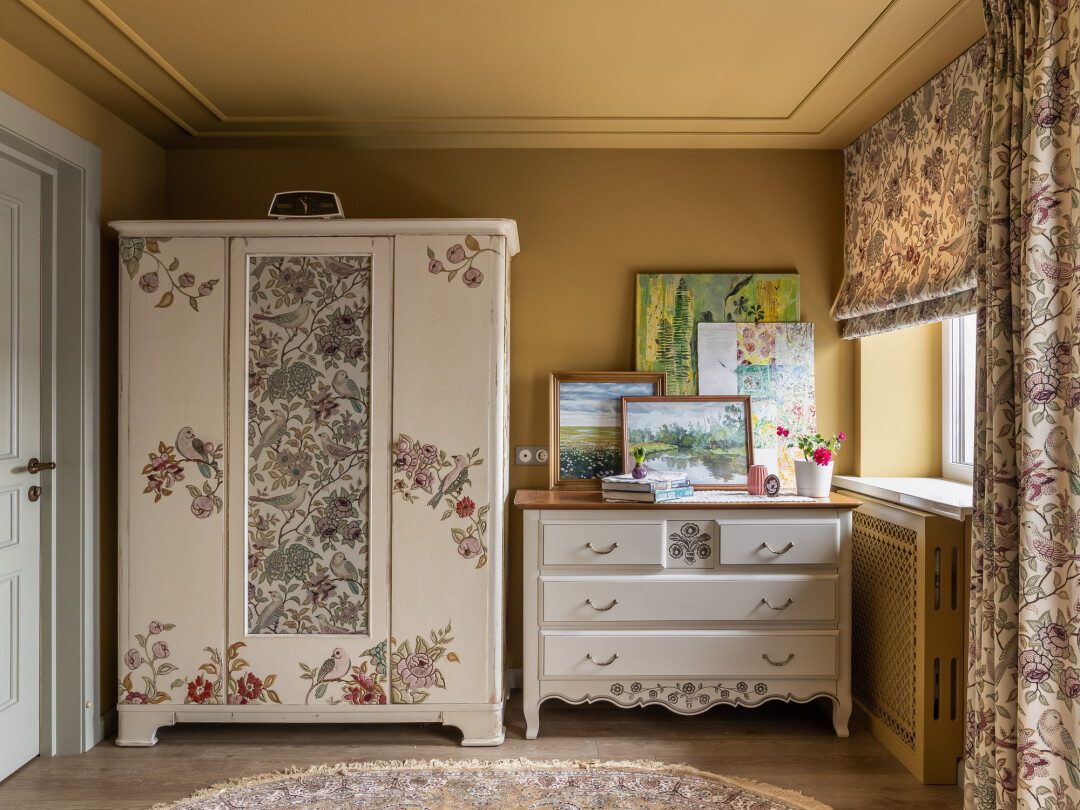 Обои шведских и английских фабрик как нельзя лучше подчеркнули традиционный стиль и преемственность дома. Во всех комнатах постарались разместить минимум один элемент обстановки прежнего дома. Так, в спальне владельцев появился отреставрированный сундук, в котором хранила наряды бабушка хозяина. Старинный платяной шкаф и комоды в стиле 30-х годов, задекорированный росписью и тканями, купили в Уфе и поставили в спальнях хозяев и их дочери.