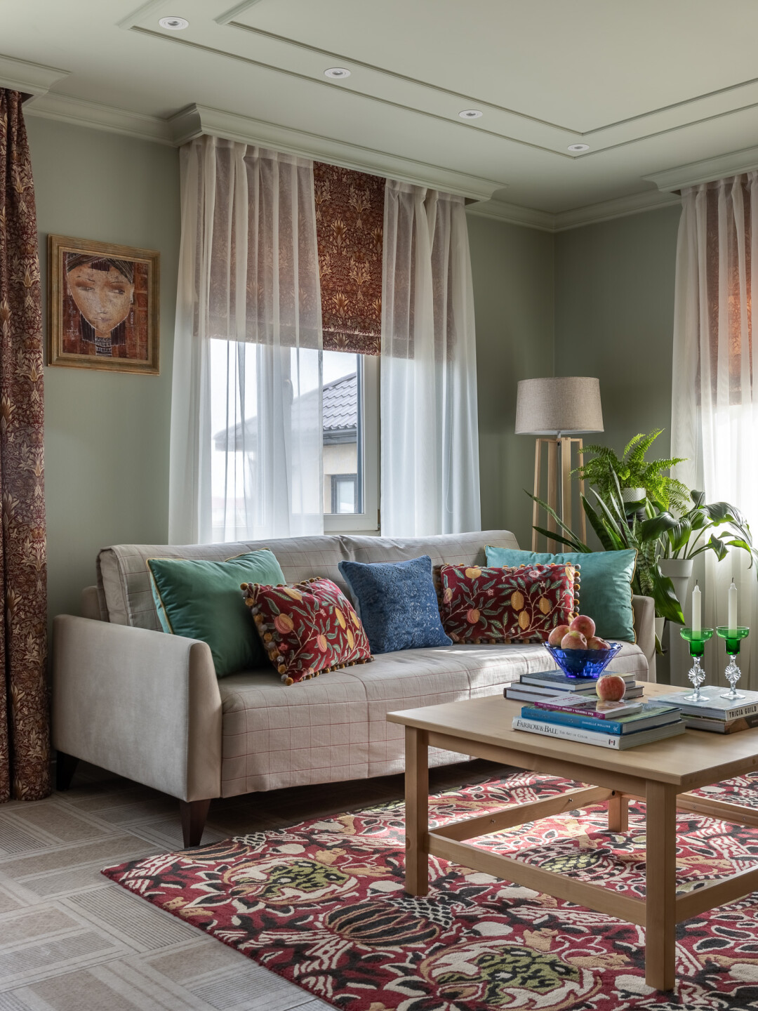 Глядя на это пространство, хочется сказать так: дом состоит из теплых и приятных воспоминаний. Дизайнер Лилия Асфандиярова сумела не только добавить в интерьер национальные мотивы и сохранить предметы старины, но и сделала коттедж функциональным.