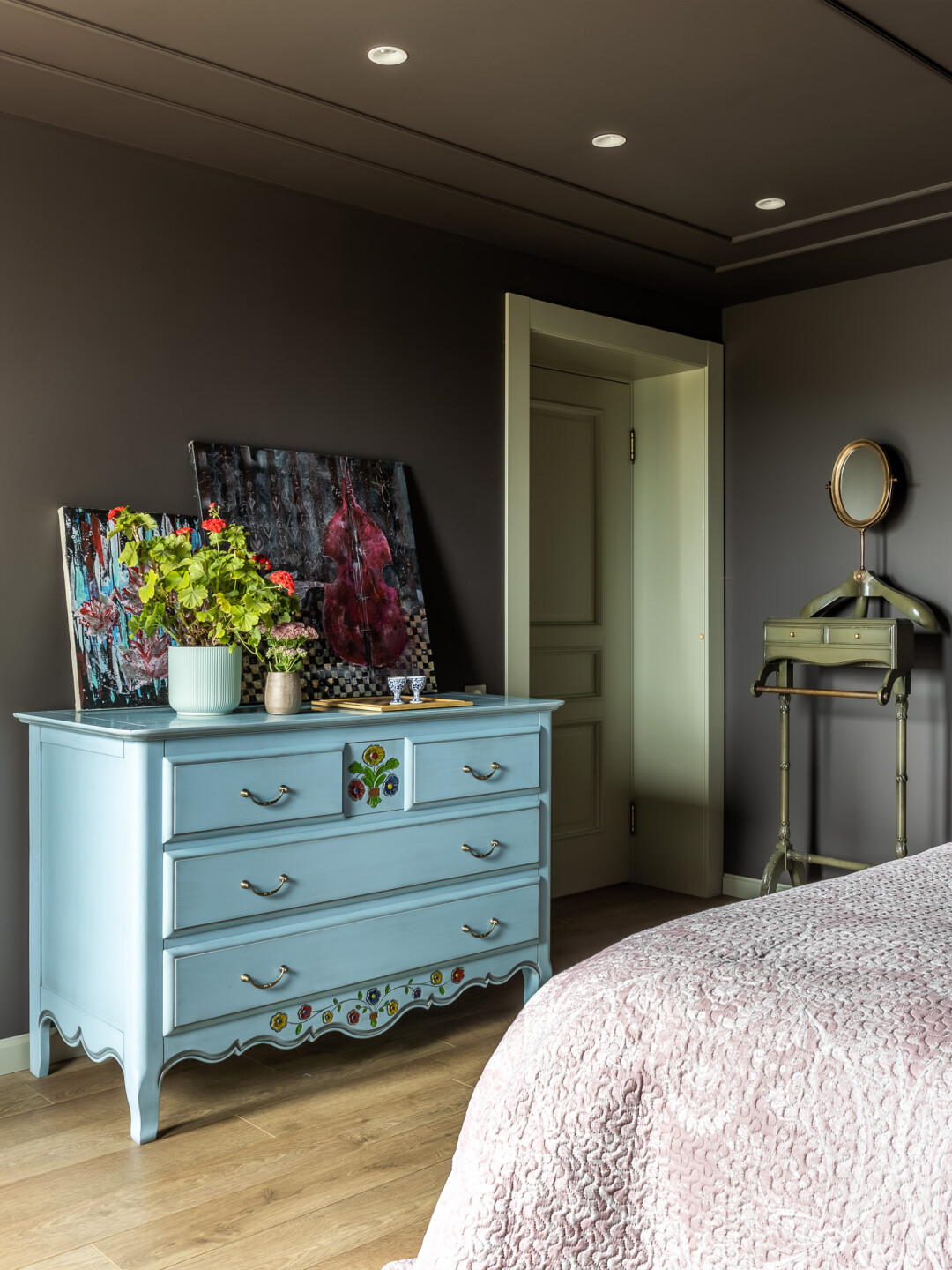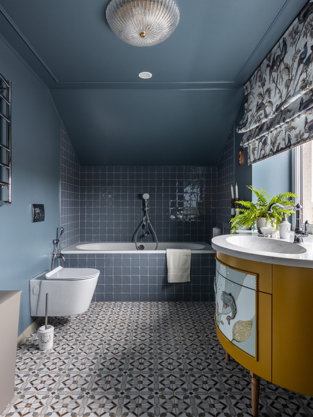 Основной проблемой стали низкие потолки, в некоторых комнатах они были всего 2,4 метра. Но с помощью декораторских приемов, сочетания стен и потолков, окрашенных в один цвет, этот недостаток визуально скорректировали. В ванной комнате скошенную стену декорировали плиткой. Еще одно украшение хозяйского санузла – тумба, изготовленная на заказ и расписанная вручную.