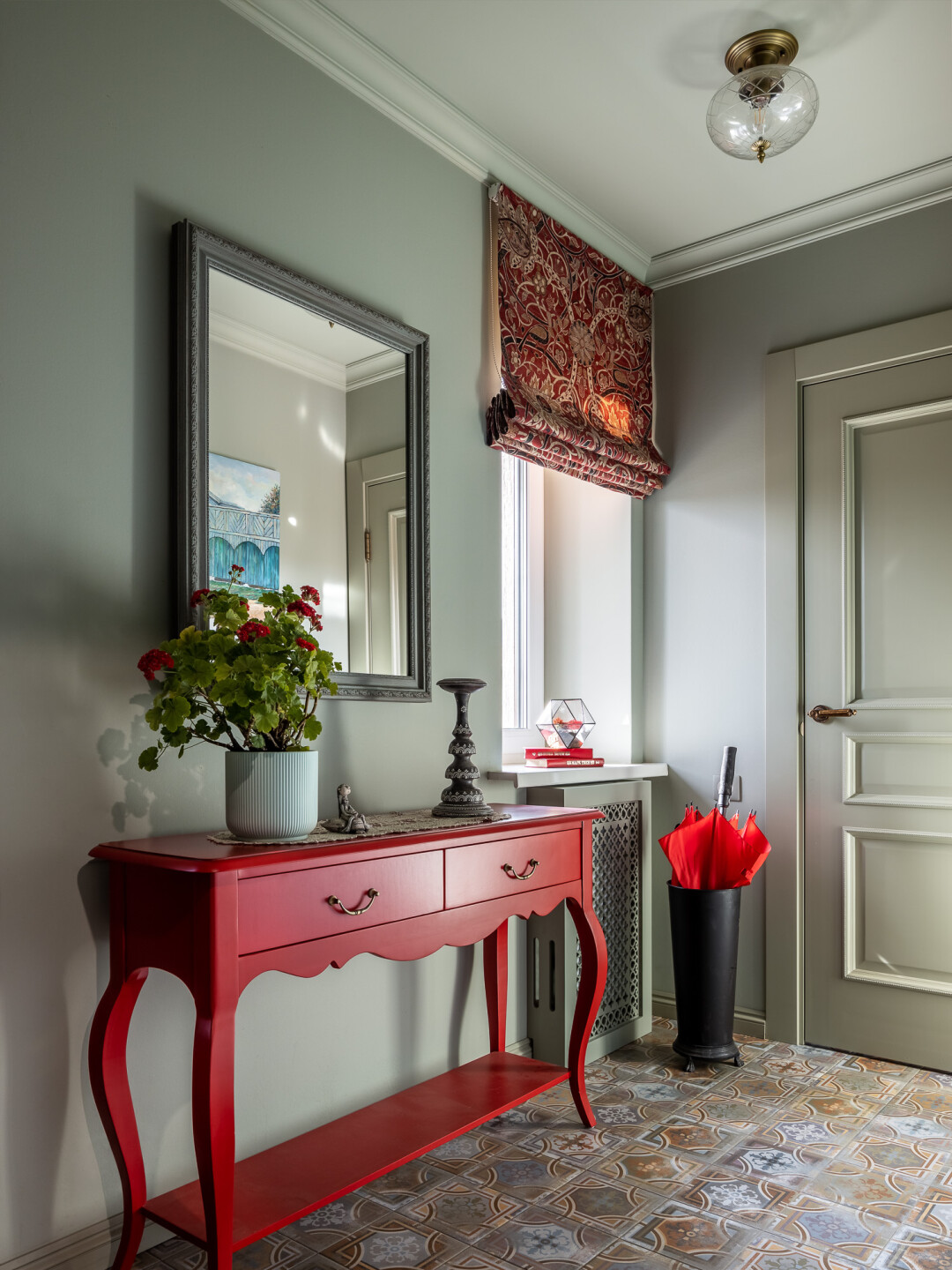 На первой встрече хозяйка сразу сказала, что не хочет коричневую деревянную лестницу и коричневые двери. Фактически разработка интерьера началась с этой ключевой фразы. Лестницу в красном цвете с буазери изготовили на заказ. Столик в прихожую подобрали в тон к лестнице, а двери установили в зеленоватых оттенках, в цвет обоев. Текстиль в дом подбирался, исходя из общей концепции дома и пожеланий дизайнера, особое внимание было уделено пошиву.