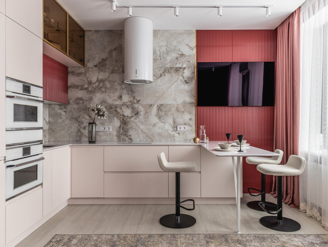 Использование барного стола вместо обеденного – настоятельное пожелание заказчиков. Благодаря кварцевой столешнице удалось изготовить барный стол в единой композиции с кухонной столешницей.