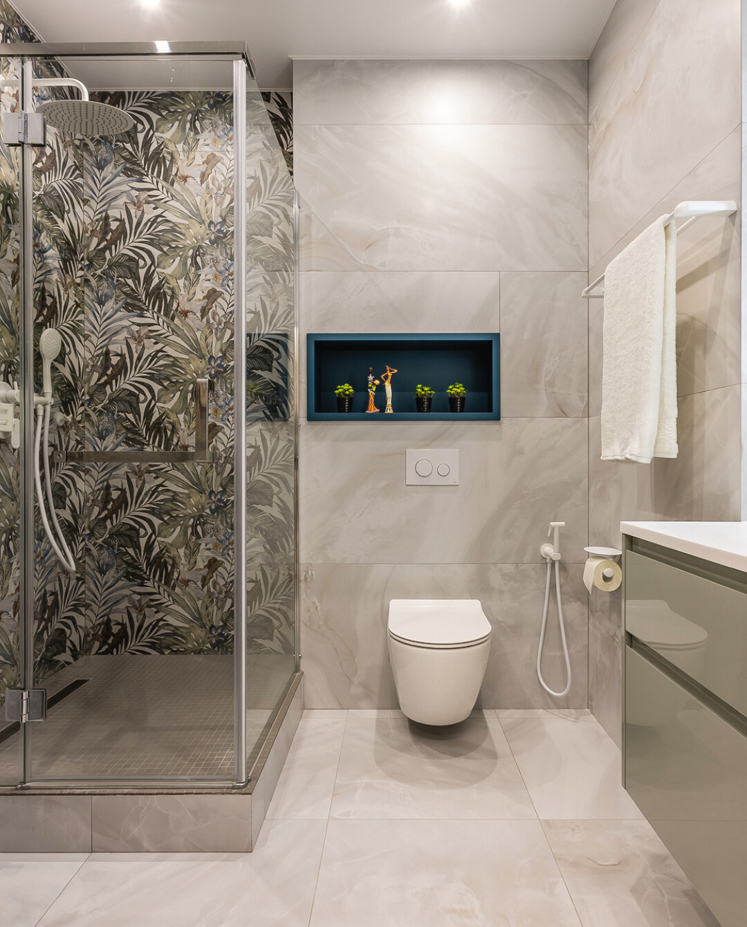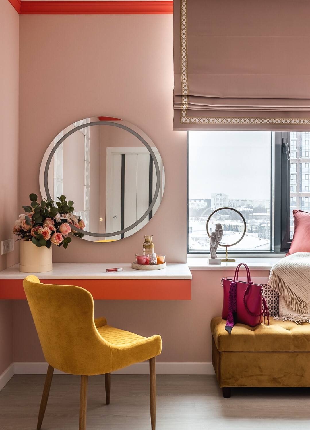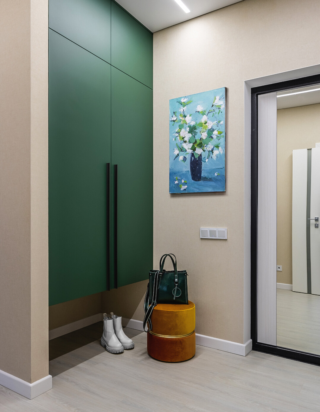 Являясь одним из главных элементов интерьера, шторы блэкаут выполняют одновременно и декоративную, и практичную функцию, снижая уровень солнечного света. Подвесная конструкция шкафа в прихожей позволяет сушить и хранить обувь ежедневного использования прямо под ним, на полу.
