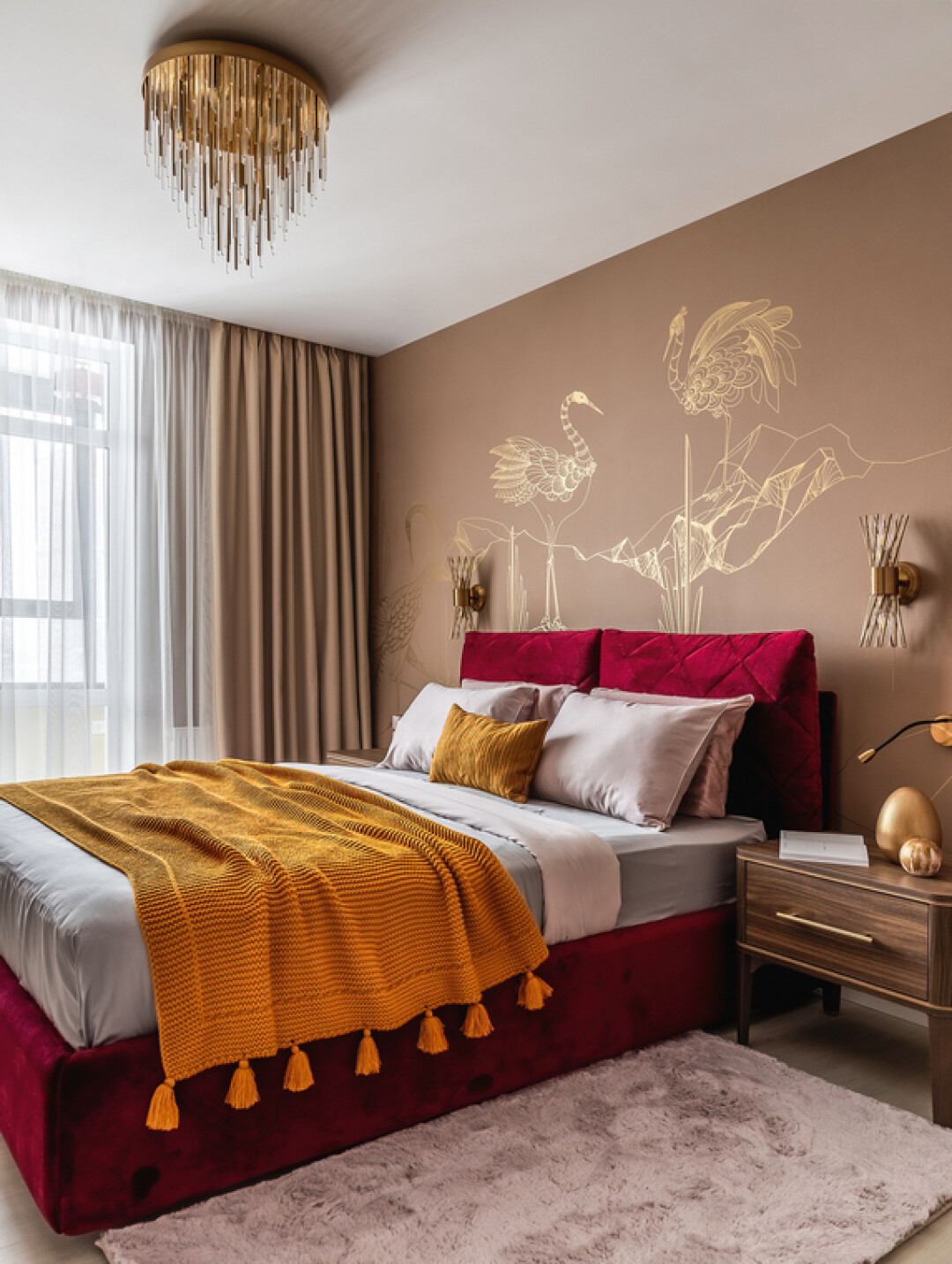 Рассказывая о спальне, хочется отметить кровать с мягким изголовьем и царгой – она является главным элементом комнаты хозяев, обеспечивая им королевский сон. Дизайн светильников и бра подчеркивает элементы изображения панно, дополняя единством образ помещения.