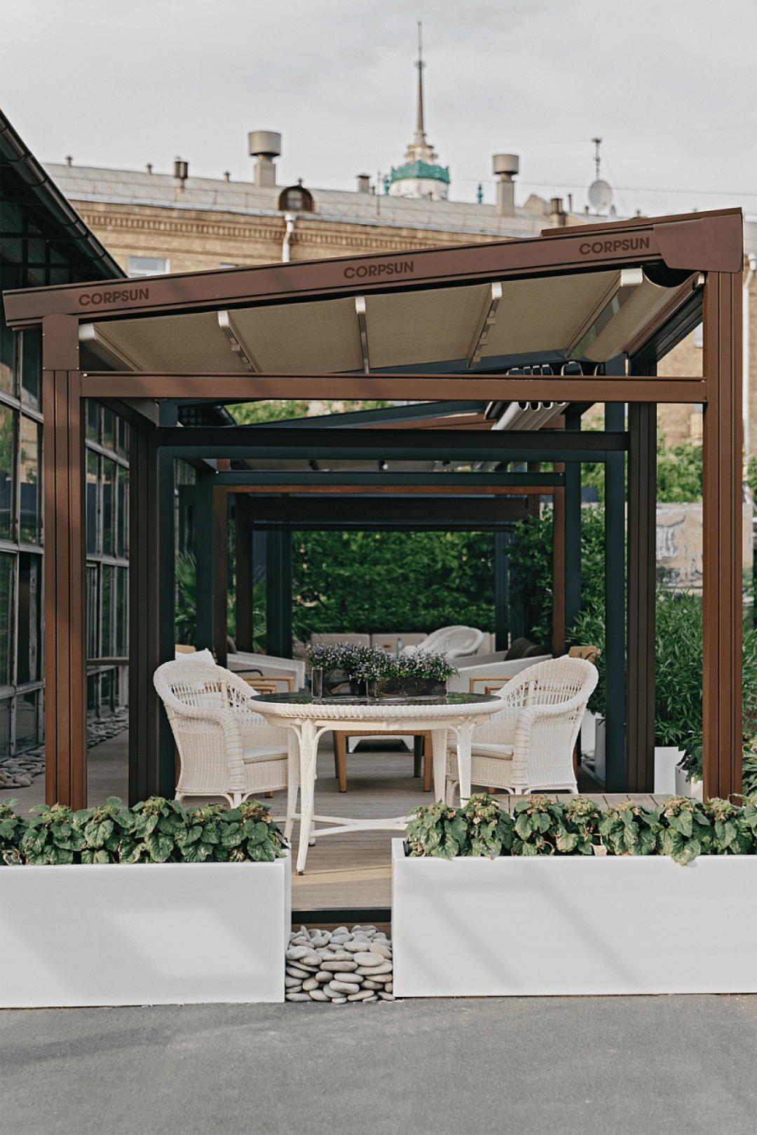 Пергола создана для того, чтобы обеспечить комфортный отдых под открытым небом при любой погоде. Навесы могут быть разными: примыкать к постройке, стоять отдельно (центральная опора или ряд боковых), с одно- или двускатной крышей, с поворотными ламелями или раздвижным тентом на крыше. Такая веранда отлично защищает от палящего солнца и плохой погоды. Современные конструкции оснащают автоматической крышей, LED-освещением, системой управления погодой со смартфона или пульта. А еще в перголах предусмотрена защита от дождя. Специальный профиль герметично на 100% блокирует воду, перенаправляя ее в желоб.