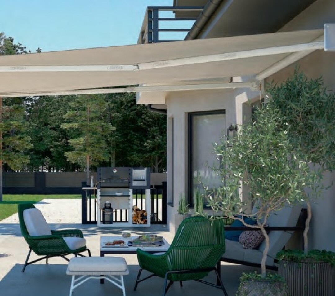 Более простой способ скрыться от лучей и дождя – установить маркизы. Конструкция примыкает прямо к дому, ее крепят над окном, дверьми, балконом или верандой. В качестве тента в них используются ткани с суперспособностями: они не пропускают влагу, не выцветают, обладают грязе- и пылеотталкивающими свойствами.