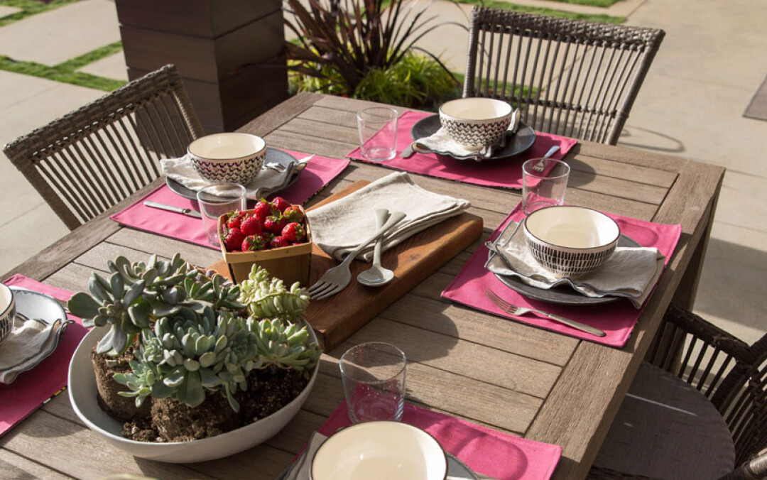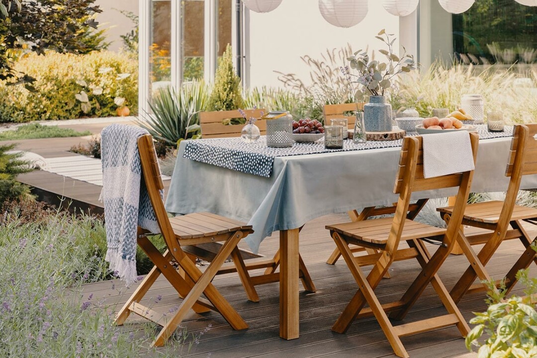 Свозить на дачу старую посуду – моветон. Забудьте об этом: прием пищи за городом – это особое удовольствие. Окружите себя эстетикой: красивая мебель, посуда, и, конечно, скатерть и салфетки с красочным рисунком. Грамотно подобранный домашний текстиль волшебным образом преображает любой интерьер. Обратите внимание на плотные ткани проверенных брендов, чтобы материал не выгорел на солнце. Лучше всего выбрать и заказать скатерти, салфетки и дорожки для стола в специализированном салоне.
