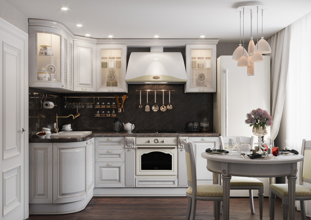 Придерживайтесь гармонии во всем. Этот принцип касается и выбора обеденной группы. Столы и стулья в зоне приема пищи должны сочетаться с общей концепцией. При этом даже в небольшом помещении правильно подобранный комплект способен зонировать пространство и создать уют. Изначально лучше отталкиваться от габаритов кухни. Если комната позволяет поставить большой стол и широкие стулья, не отказывайте себе в этом. Для маленьких помещений (даже если вам нравится роскошная обеденная группа) лучше сделать выбор в пользу компактных лаконичных моделей, например, купить стулья без подлокотников.