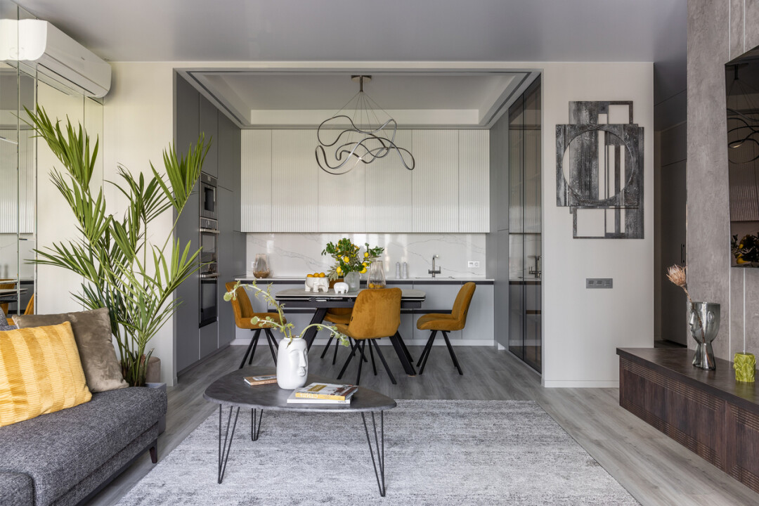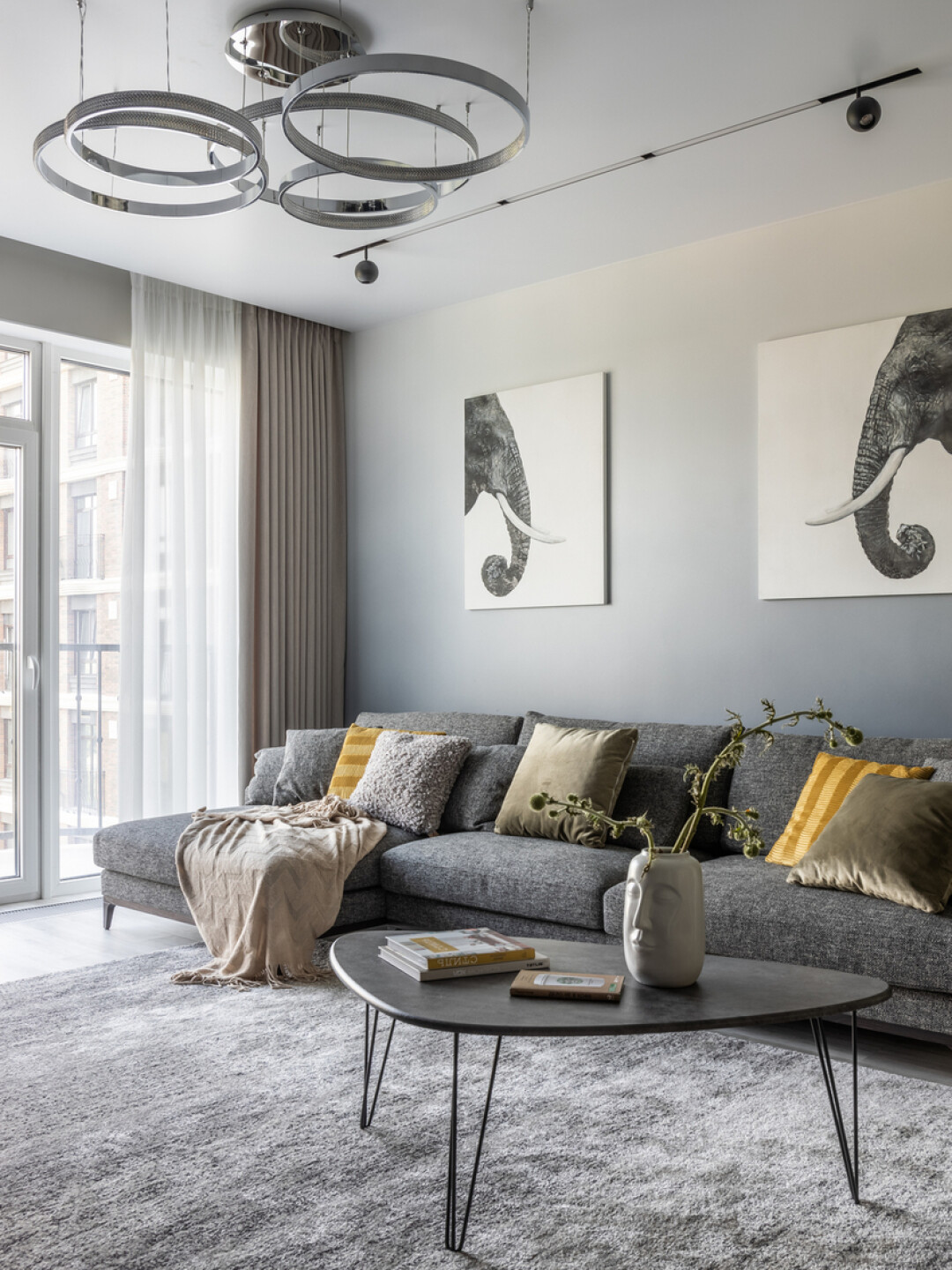 Мы сохранили изначальную планировку комнат, поменяли пропорции холла и зоны санузла. Смысловым центром кухни-гостиной стал обеденный стол под люстрой авангардной формы от студии «Белая лампа». Основная гамма – серая, с акцентом на игре текстур, от авторской декоративной штукатурки до плавного перехода-градиента. Пластичные линии – люстра, картины со слонами, столик – контрастируют с прямыми и прямоугольными формами.