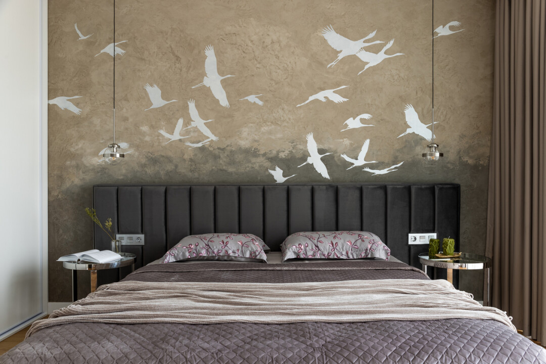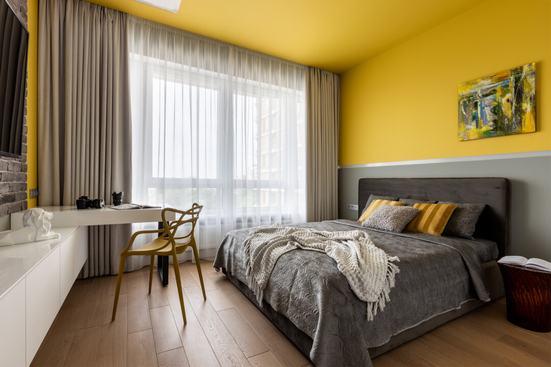 ентральный мотив спальни – летящие журавли, чей полет к окну, где нередко видны стаи птиц: выглядит так, словно нарисованные создания превращаются в настоящих. Детская для сына-подростка получилась динамичной благодаря сочетанию серого и желтого, а также геометрии световых линий и цветовых пятен.