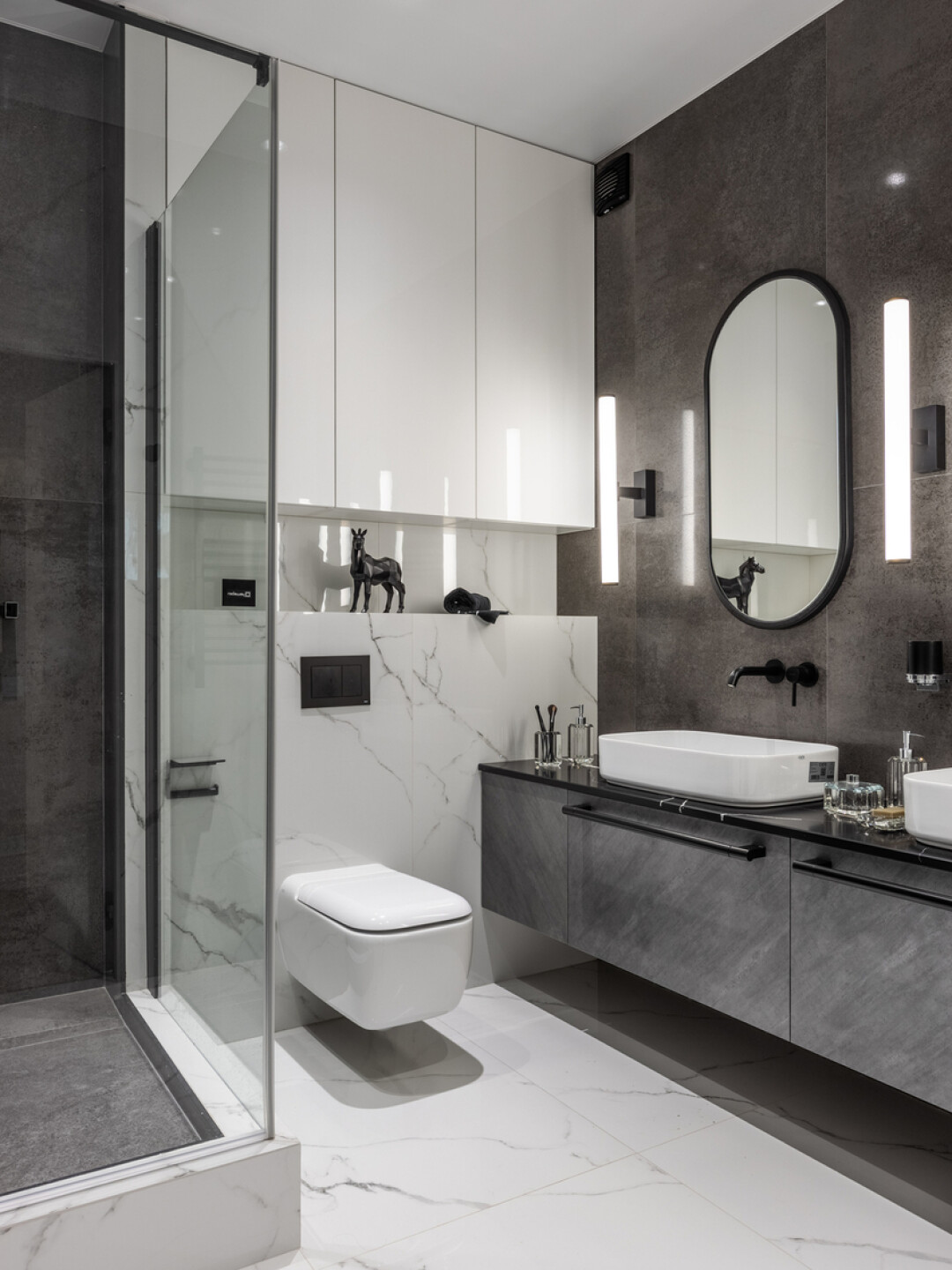 Кровати в обеих комнатах сделаны на заказ. В черно-белом санузле взгляд сразу останавливается на большой столешнице с двумя чашами-раковинами. Мы подобрали элементы не только по качеству, но и по оттенкам: черные смесители идеально сочетаются по цвету с полотенцесушителем и душевой, то же и с белыми раковинами и унитазом. В итоге у нас получился современный, лаконичный интерьер – хороший фон для дальнейшего творчества хозяйки в плане декорирования и насыщения деталями.