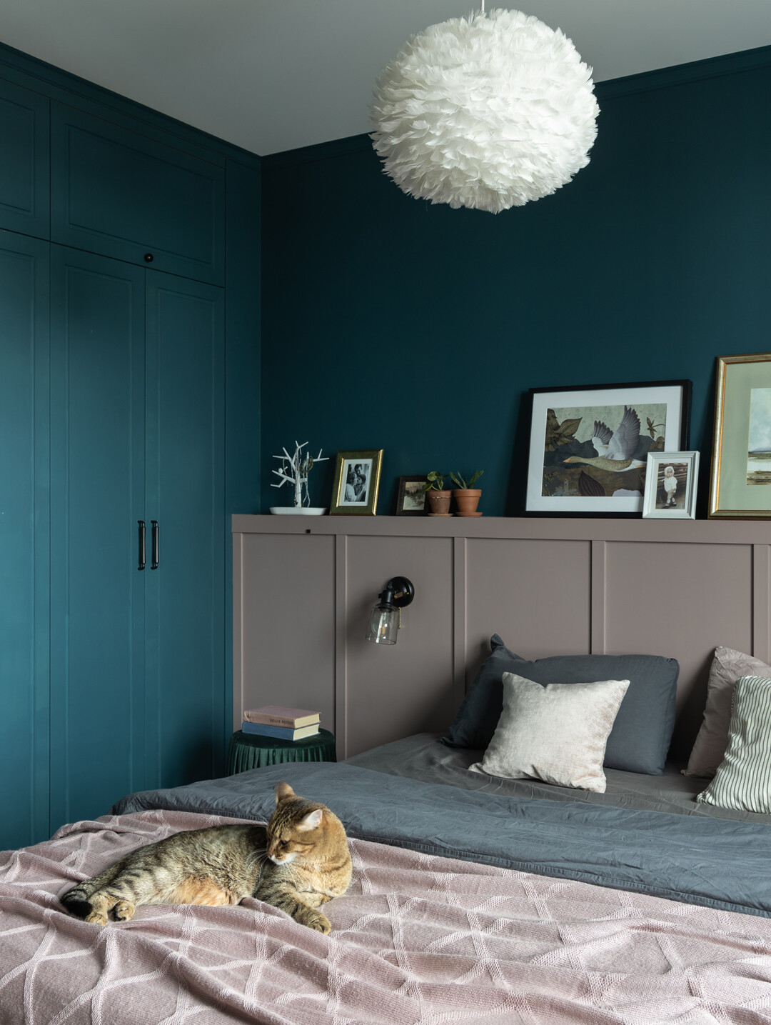 Из необычного – я предложила отказаться от стандартного мебельного изголовья кровати, а сделать за изголовьем гипсокартоновую конструкцию с вертикальными рейками.