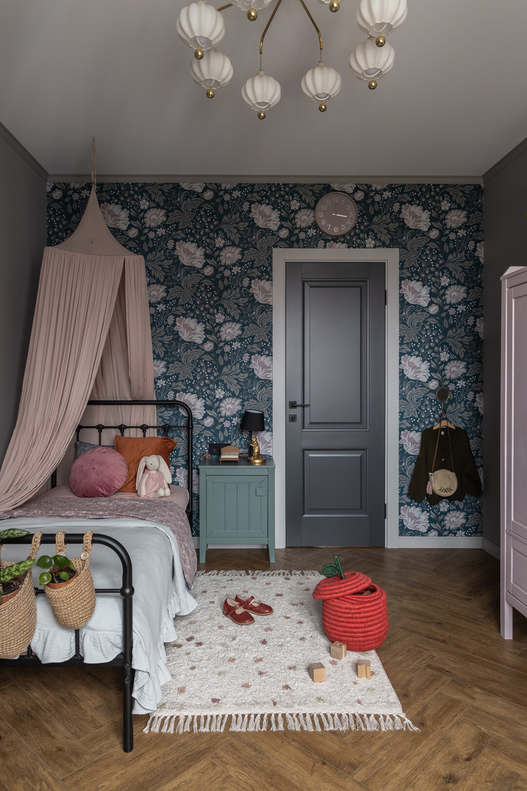 В качестве референсов интерьера детской комнаты мне показали фотографии с шикарными, нестандартными обоями за изголовьем детской кровати. Обрамление для полотен намеренно выбрали светлым. В тон к нему выкрасили плинтусы, создав единый контур.