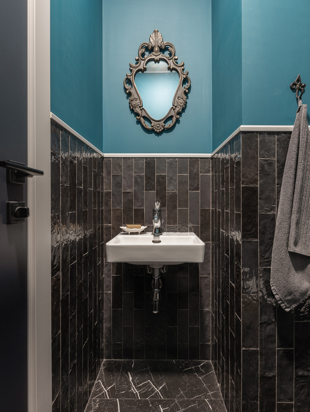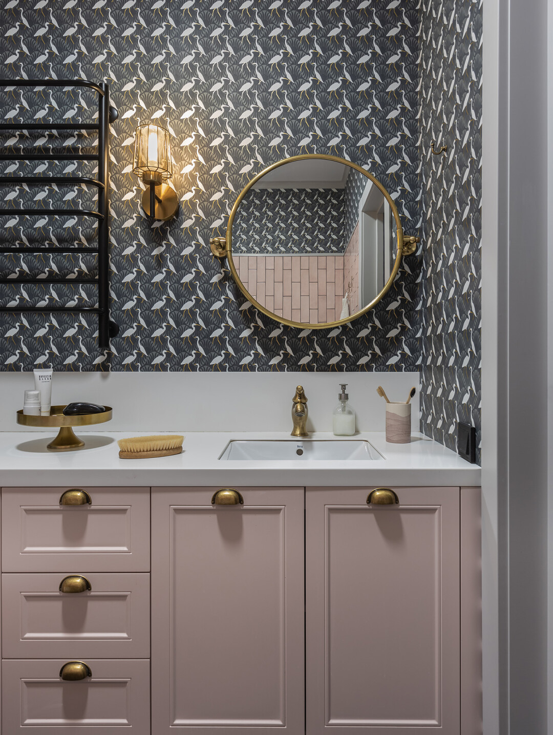 Для стен в ванной комнате использовали обои. И через год эксплуатации стена все так же прекрасна. Стоит обратить внимание на тумбу в эмали со столешницей и фартуком из искусственного камня. Заданный стиль поддержали смесители благородного латунного цвета и настенная плитка Equipe.