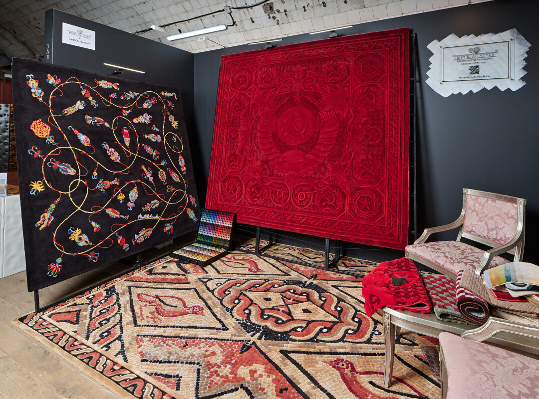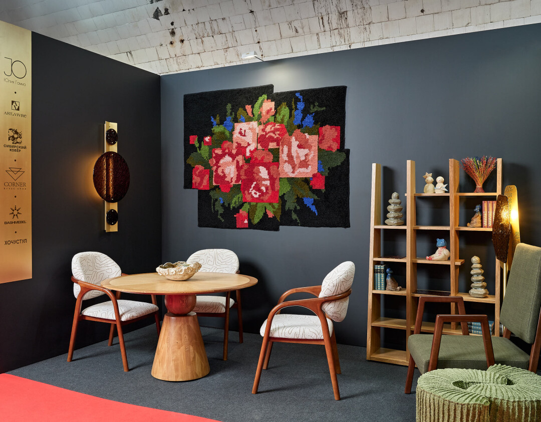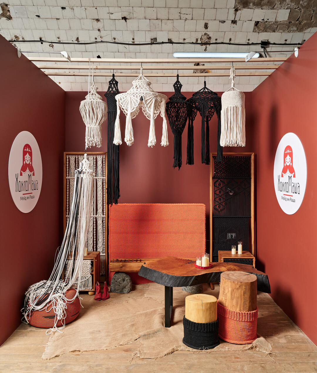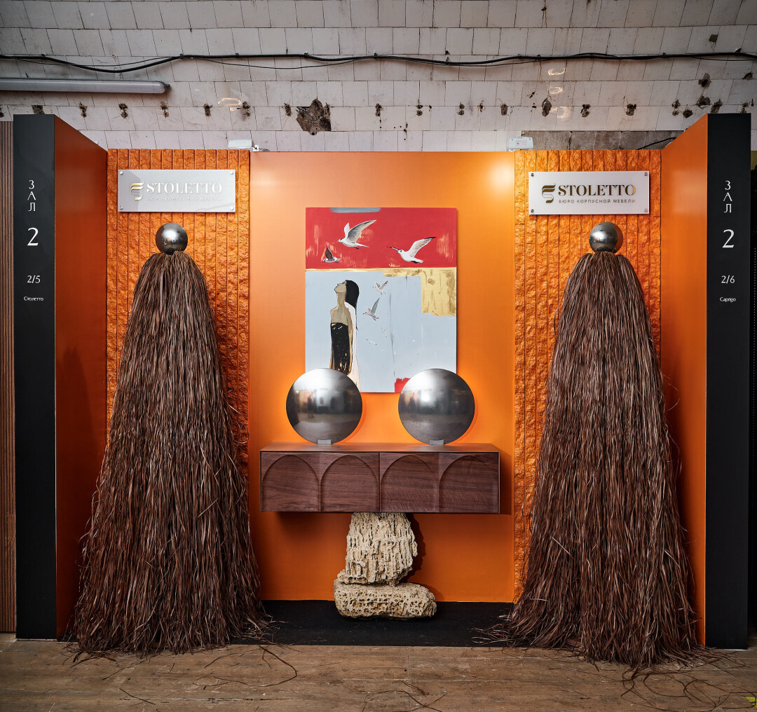 На площади 2000 кв.м свои стенды выставили 107 компаний. Все участники исследовали каноны красоты через интерьер. Так, например, дизайнер Наталья Кожедуб сделала это с помощью вышивки – языка всех народов. Стеклодувная мастерская Repin Glass из Калининграда представила коллекцию тестовую коллекцию малых мебельных форм из стекла и бетона. Столярная мастерская Stoletto создала капсульную коллекцию мебели Etty вместе с Сергеем Трегубовым: на их стенде были комод «Леший» с рельефным фасадом из массива ореха и стеллаж арт-объект в виде стога сена из натурального лыка, внутри которого спрятан стеллаж. А мы особенное внимание хотим обратить на стенд «Башмебель» с тканым ковром на стене и мебелью из натуральных материалов.