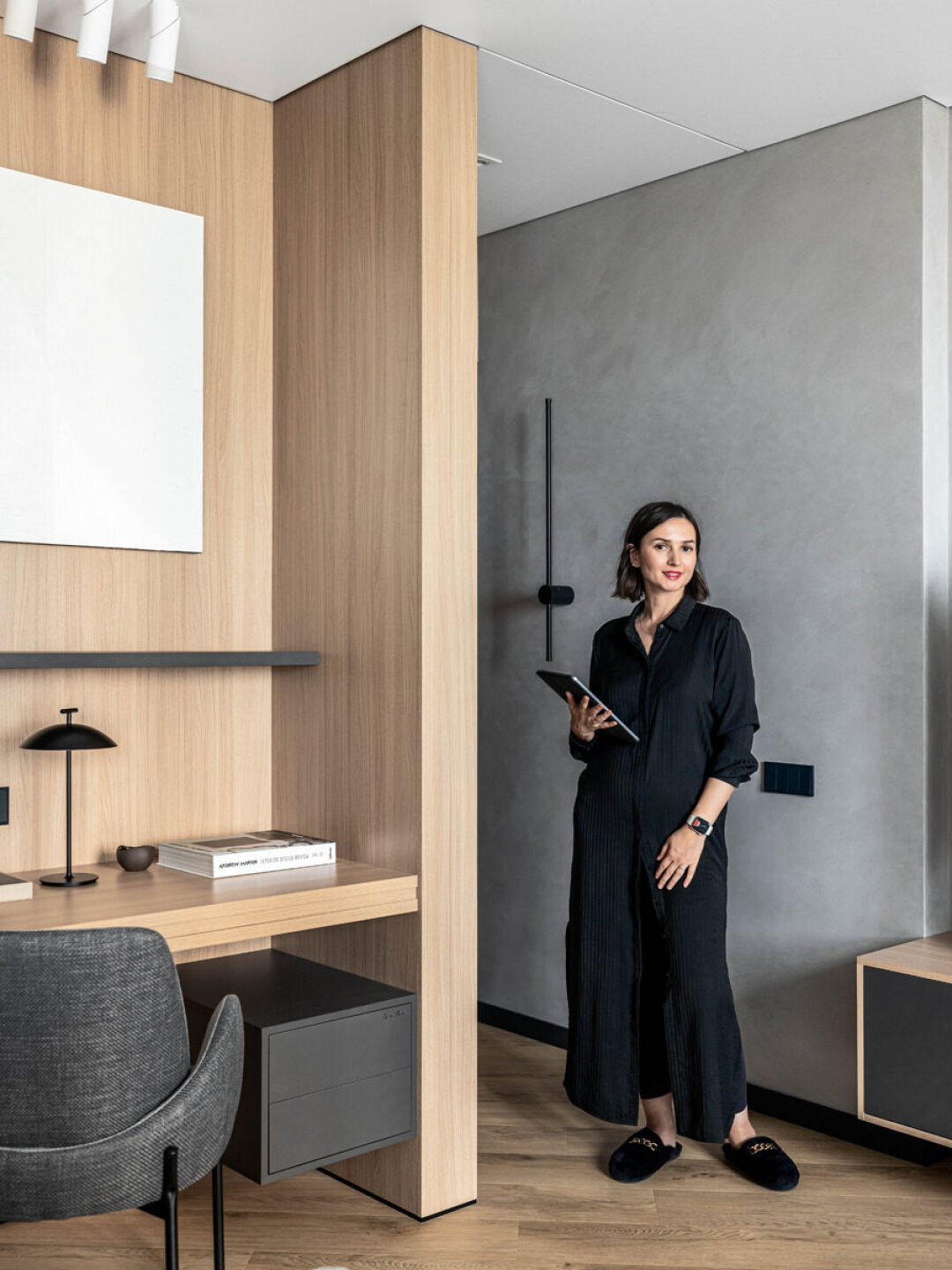 В профессии я больше двадцати лет и точно знаю: трендов на потолок не существует. Потолок – часть интерьера, и он либо поддерживает общую идею, либо становится акцентом. Акцентные потолки я использую часто, но никогда не ради самого акцента. Самый простой и действенный способ – цвет. В одном проекте потолок стал глубоким зеленым, в другом – насыщенным синим. Оба раза это сработало как холст: стены и мебель на таком фоне сразу зазвучали иначе. Еще мне нравится работать с фактурами. Деревянные рейки зрительно вытягивают пространство и добавляют ритма, а правильная лепнина – неважно, классическая или современная – придает помещению характер. Я вообще люблю лепнину и не боюсь ее использовать.