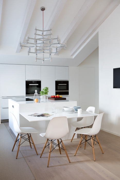Светлое открытое пространство гостиной плавно перетекает в кухню со столовой зоной Bulthaup – такую же белоснежную, как и почти все помещения в доме. По замыслу дизайнера, только этот цвет позволяет с помощью разных источников света создавать всегда разную атмосферу в доме: именно поэтому люстрам, лампам и торшерам в доме отведено особое значение. Весь потолочный свет в доме, конечно, Martini Light, а, например, алюминиевая люстра над кухонным островом сделана брендом Nemo, одной из дочерних компаний Cassina. Столешница, как и все поверхности кухни, сделана из искусственного мрамора Corian, а дополняют минимализм интерьера стулья DSW фирмы Vitra, созданные дизайнером Charles Eames в 1960 году.