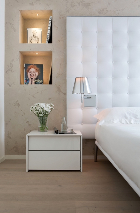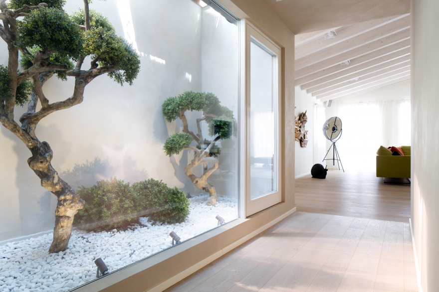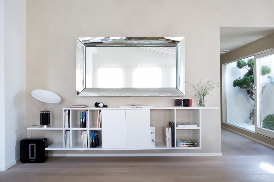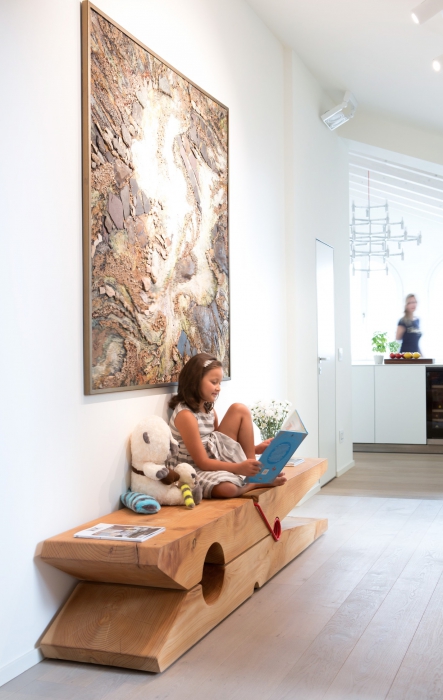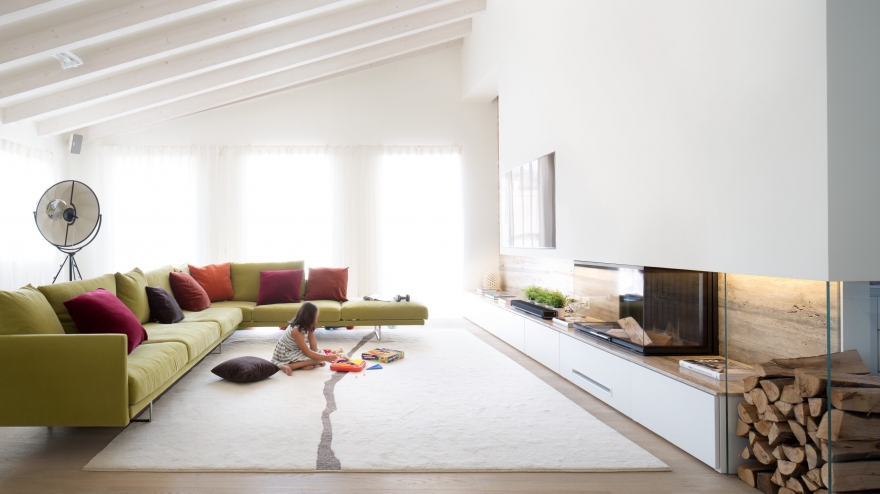 Дизайн-проект квартиры было решено доверить архитектору Микеле Перлини, известному специалисту в области строительства и реставрации домов и апартаментов с сертификатами Casa Clima – особой системы энергоэффективности и экологичности. Это касается всех материалов, использованных при ремонте: изоляции Multipor, гипсовых стен Fermacell, красок KeraKoll, дубового паркета Maffi, пропитанного специальным натуральным мылом, стеклопакетов из дерева марки Tip Top, автоматической системы вентиляции и фильтров, которая позволяет произвести обмен воздуха в каждой комнате в течение часа, не открывая окон. Всеми системами дома – вентиляцией, светосценариями, температурой в комнатах, музыкой, сигнализацией и всем остальным – можно управлять как на расстоянии через смартфон или компьютер, так и внутри дома через телефон или специальные пульты.