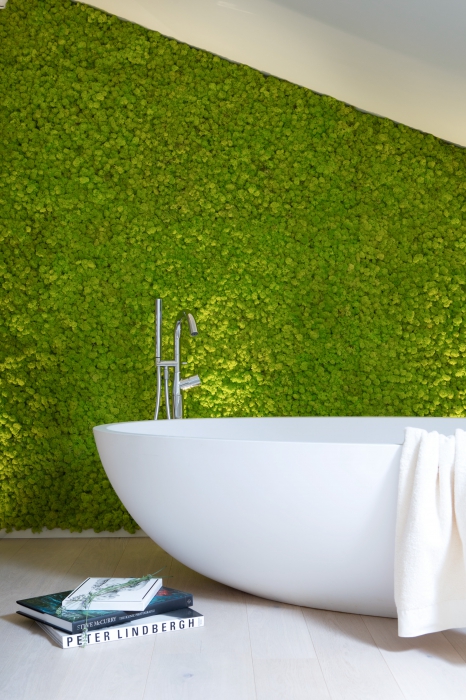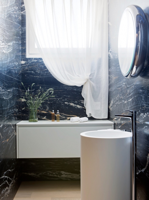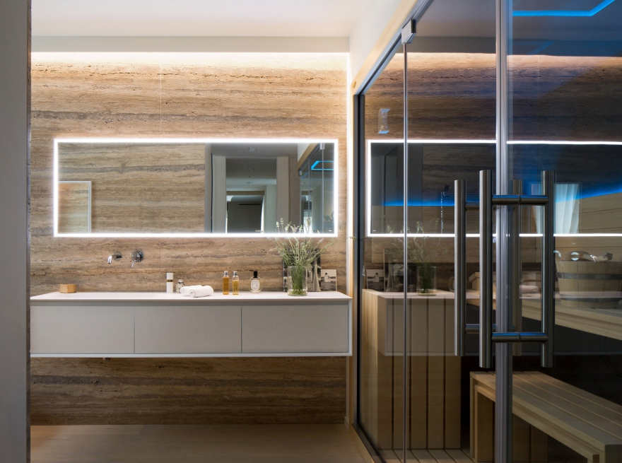 Хозяйская спальня, так же как и многие комнаты дома, дополнена мебелью бренда Cassina: ему принадлежит кровать с массивным изголовьем, оформленным светильниками Flos. Рабочую зону создают стол Furtif французской марки Roche Bobois, табуреты Knoll и лампа того же Flos. Спокойную и расслабляющую атмосферу призвано поддерживать и мини-спа Jacuzzi Sash, обустроенное в одной из ванных комнат. Помимо натурального дерева и камня, встроенных источников звука и ароматов, спа оснащено функциями сауны, турецкой бани и душа-дождя. Для отделки стен родительской ванной использован травертин сильвер, а для пола – дубовая доска, в то время как в других ванных в доме встречаются черный мрамор Zebrino и даже настоящий законсервированный мох, приводящий в восторг всех гостей пентхауса.