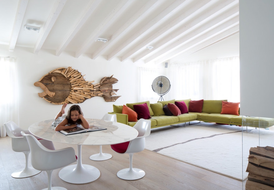 Главное место в доме, как и положено, отведено гостиной. Скошенный потолок с открытыми балками перекрытия и огромное зеркало из ударопрочного посеребренного стекла Caadre по дизайну Филиппа Старка для Fiam только добавляют комнате легкости и света, не отвлекая от самого интересного: стены с камином и стеклянным шкафом, в котором хранятся настоящие дрова для топки. Зону отдыха продолжают диван Cassina с разноцветными подушками, ковер, сотканный вручную тибетскими монахами, и лампа-тренога Fortuny, дизайн которой был создан испанским художником и модельером Мариано Фортуни-и-Мадрасо еще в 1907 году. За функцию хранения отвечают ниши в стене и небольшая этажерка, созданная по эскизу автора проекта Микеле Перлини. Для приема гостей и встреч с семьей по вечерам в центре комнаты установили овальный мраморный стол и стулья Tulip, которые известный дизайнер Ээро Сааринен создал еще в 1957 году, – все от американского бренда Knoll. Вообще при выборе мебели владельцы дома отдали предпочтение иконам пятидесятых годов, которые и сегодня не теряют актуальности. Настоящее украшение гостиной и гордость владельцев дома – панно в виде рыбы, сделанное из кусочков дерева, возраст которых насчитывает до шестисот лет, известным в Вероне художником Микеле Симони.