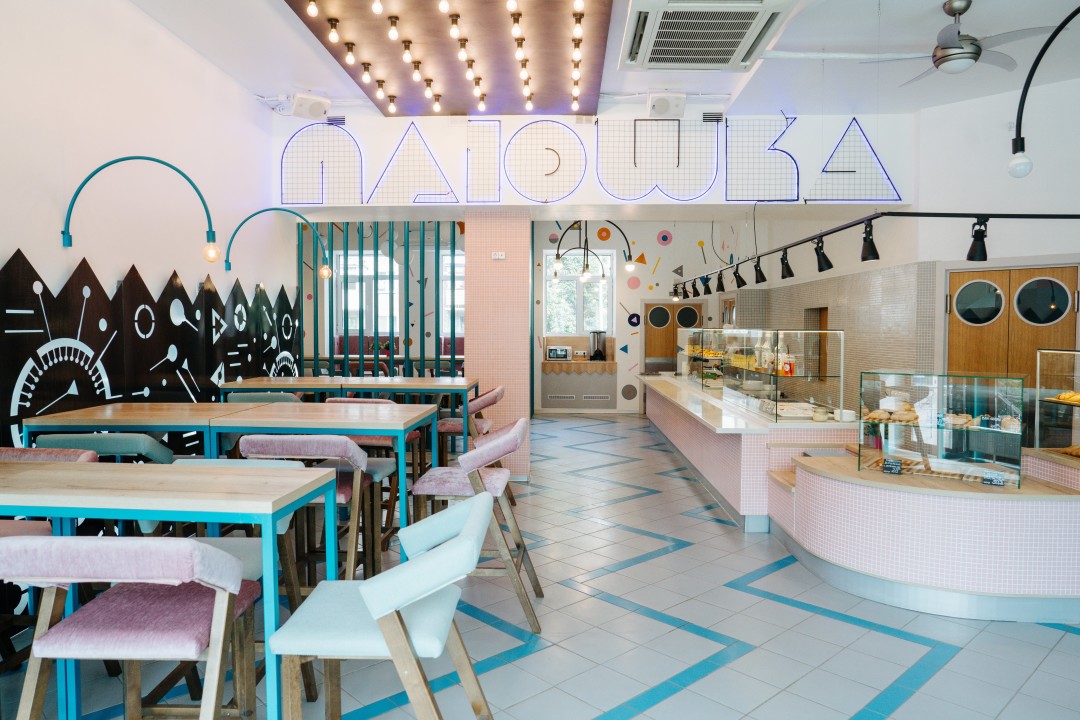Придумывая интерьер кафе «Плюшка», авторы проекта Данил и Елена Диваевы хотели разрушить устоявшийся консервативный формат кулинарий национальной кухни и сделать сложносочиненное, но простое пространство. Источником вдохновения стала поездка в Голландию.