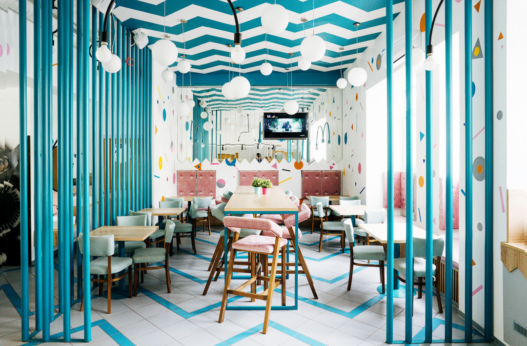 Мы условно поделили помещение на две основные зоны: кондитерскую с высокими столами и барными стульями, и кафе, где можно основательно посидеть, – в нем разместили мягкие кресла и диванчики за ширмой из голубых железных трубочек.