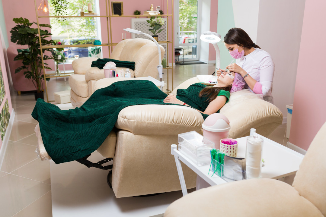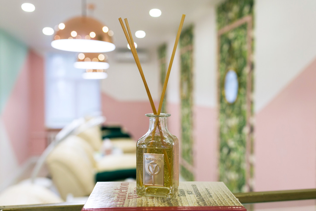 Салон четко делится на две зоны – гостевую и рабочую. В первой, где также оформляют и ламинируют брови, расположена стойка администратора, розовый диван возле большого окна, интерьер декорирован растениями и подушками с флоральным принтом. Украшает эту зону ожидания люстра, оформленная в стиле минимализм.