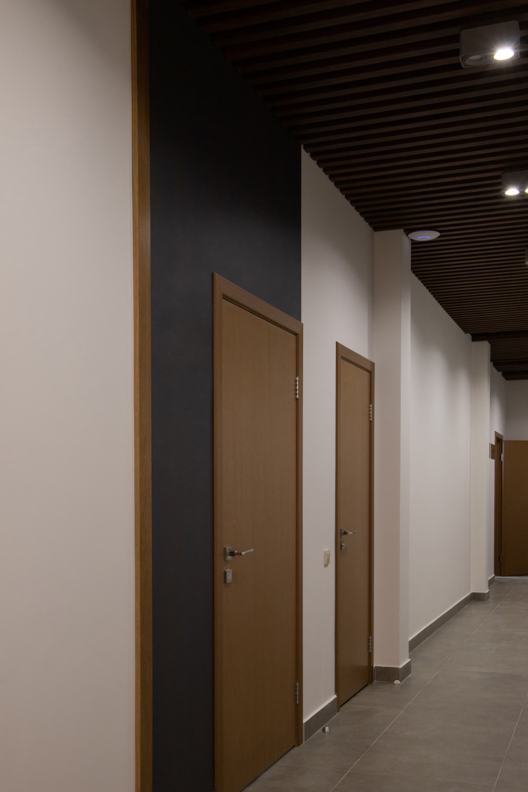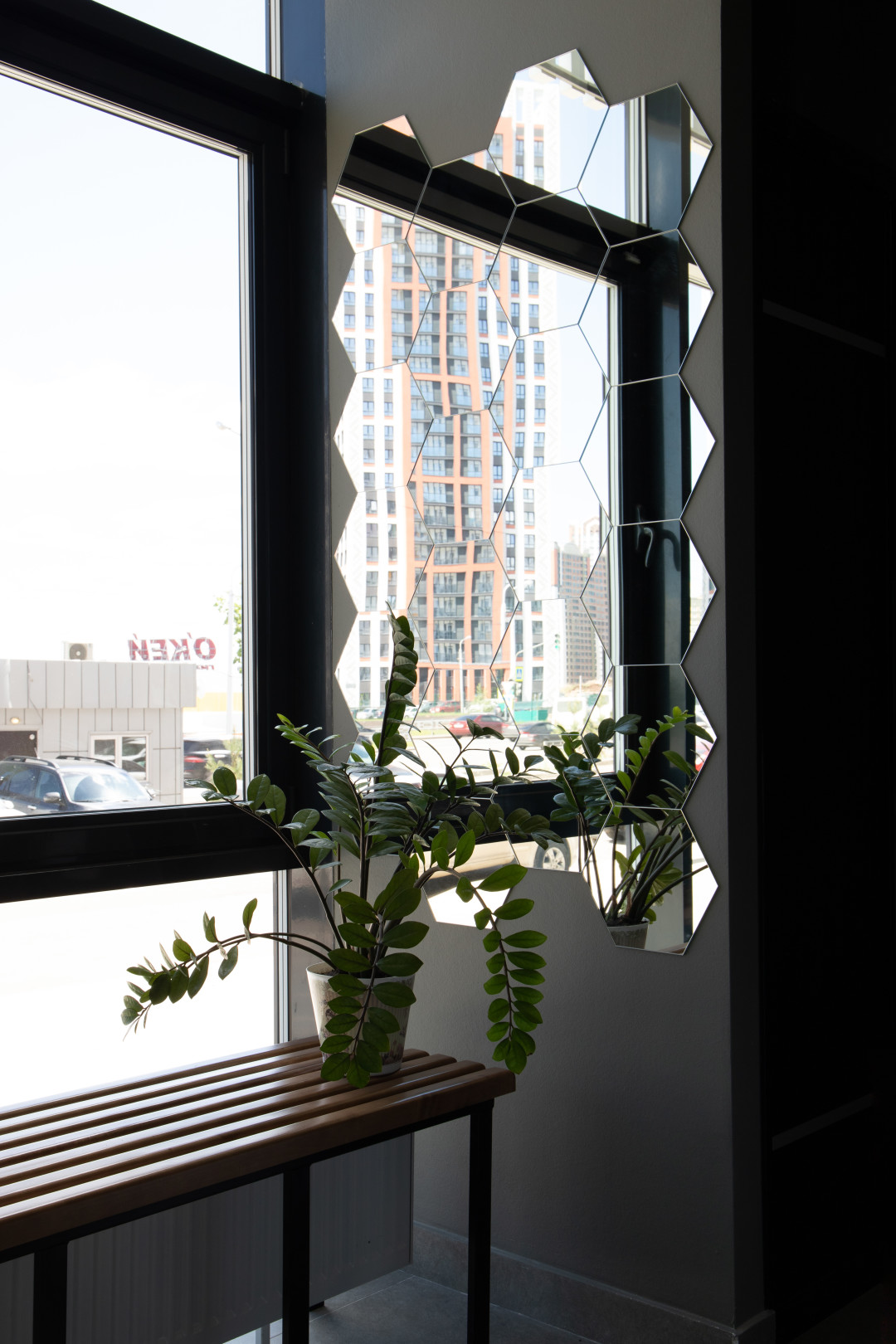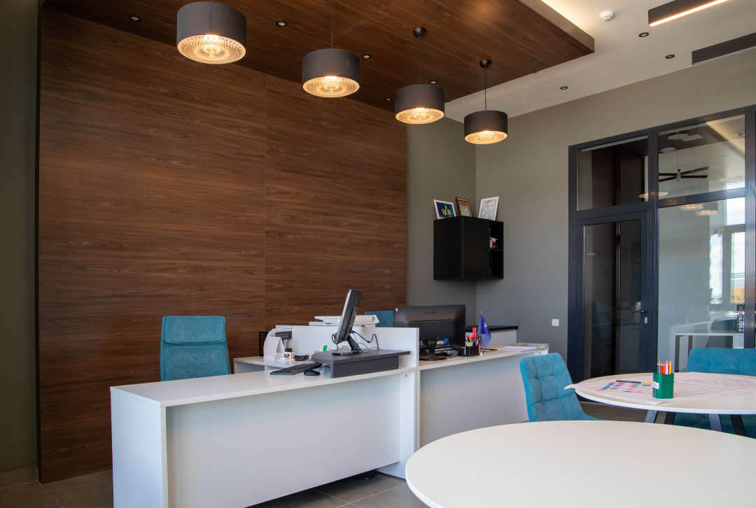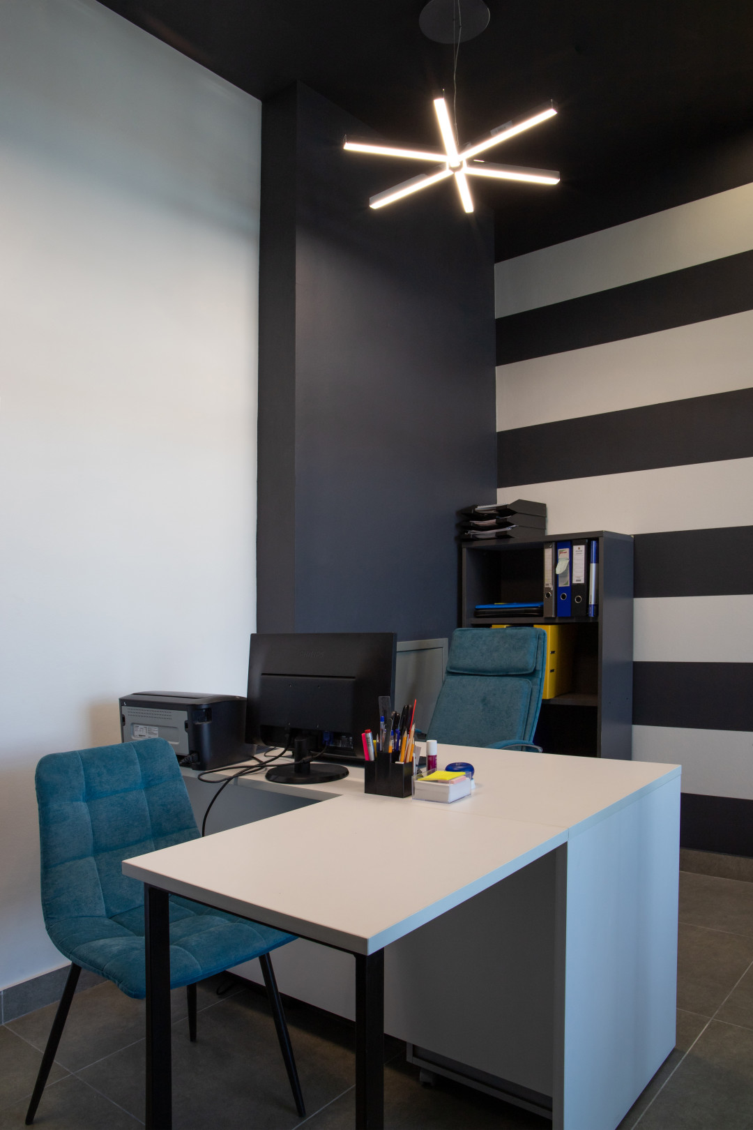 Дизайнерам нужно было с нуля разработать современный интерьер строительной фирмы, разделив внешний поток посетителей от сотрудников и отразив в дизайне специфику деятельности фирмы. Поэтому первый этаж они оставили для переговоров и встреч с клиентами, а второй отвели под кабинеты менеджеров и руководства. Идея проекта была сформирована сочетанием минималистичных фактур и «брутальных» строительных материалов, таких как бетон, кирпич, стекло.