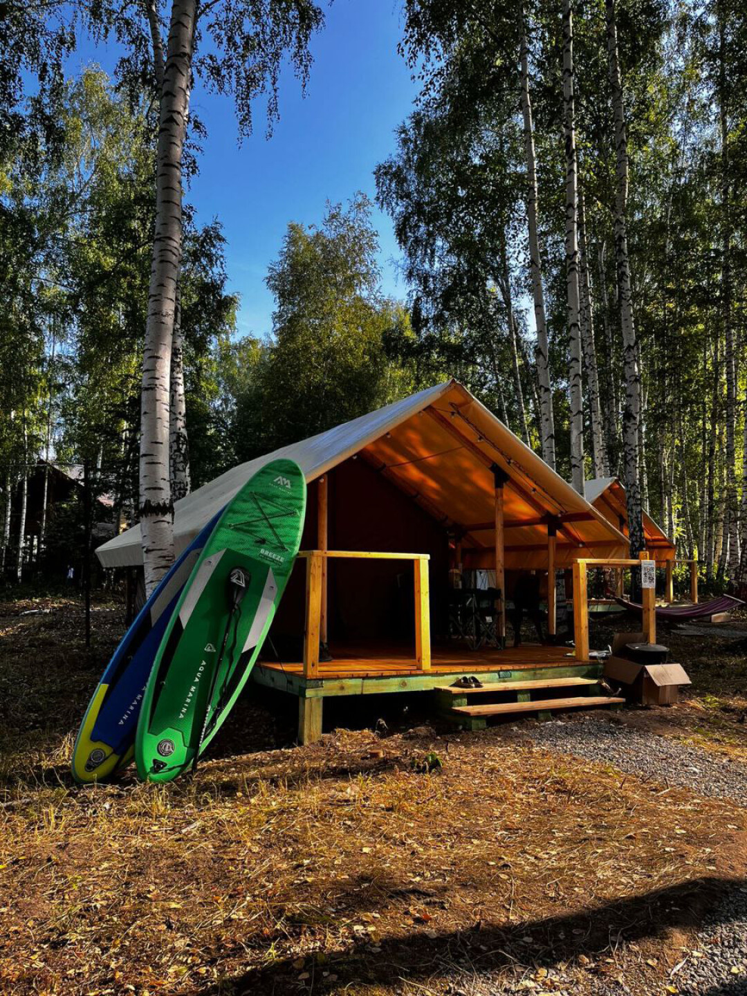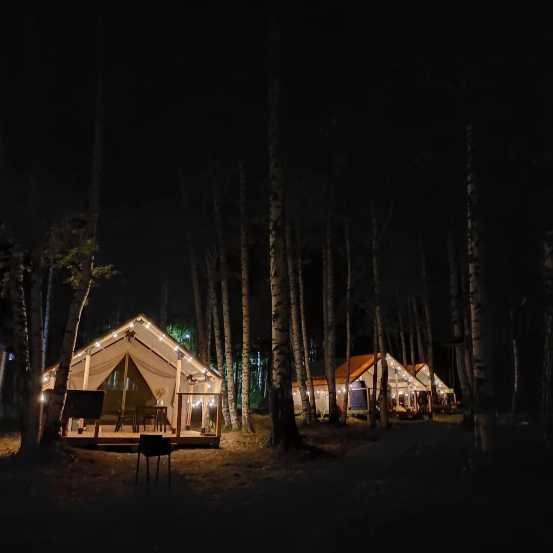 Глэмпинг находится на первой береговой линии Павловского водохранилища. Сафари-тенты обосновались в тихом местечке посреди березовой рощи на территории отеля «Башкирская Рица». Домики площадью 4*8 м внешне похожи на палатки, но возведены из прочного деревянного каркаса и обтянуты тентом. Всего сафари-тентов пять: в каждом есть отопление, кровати, мини-кухня и холодильник. К номерам прилегает собственная веранда.