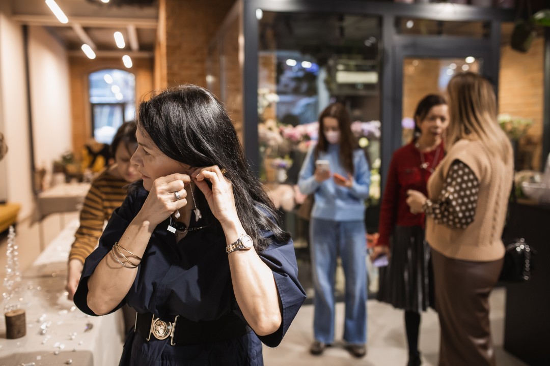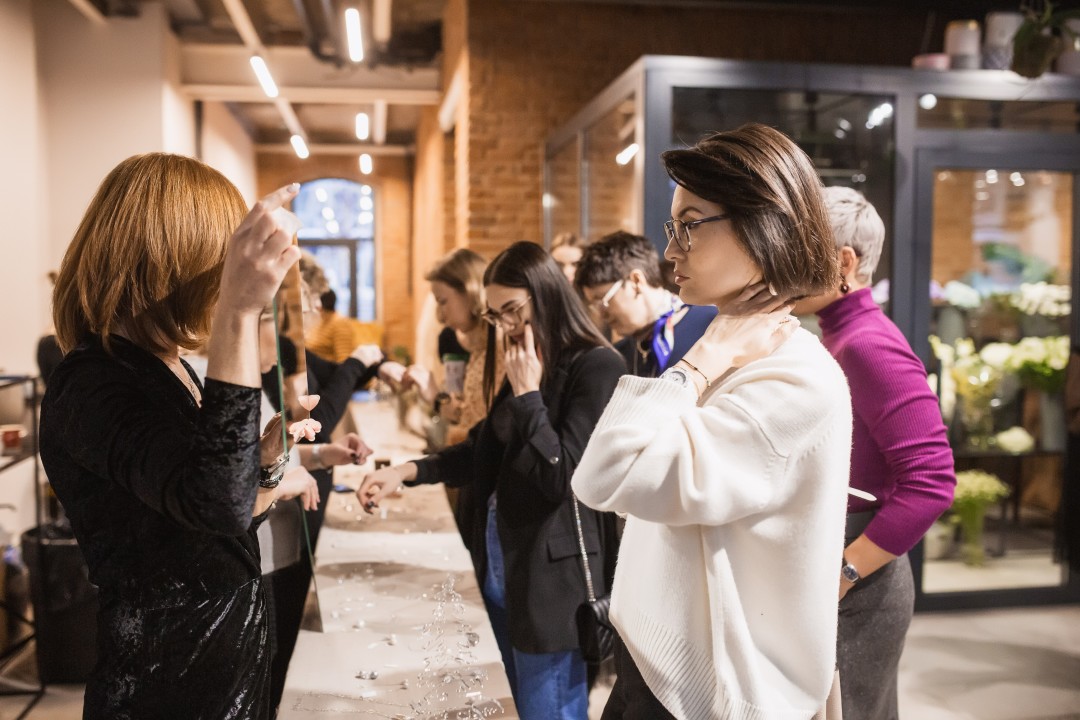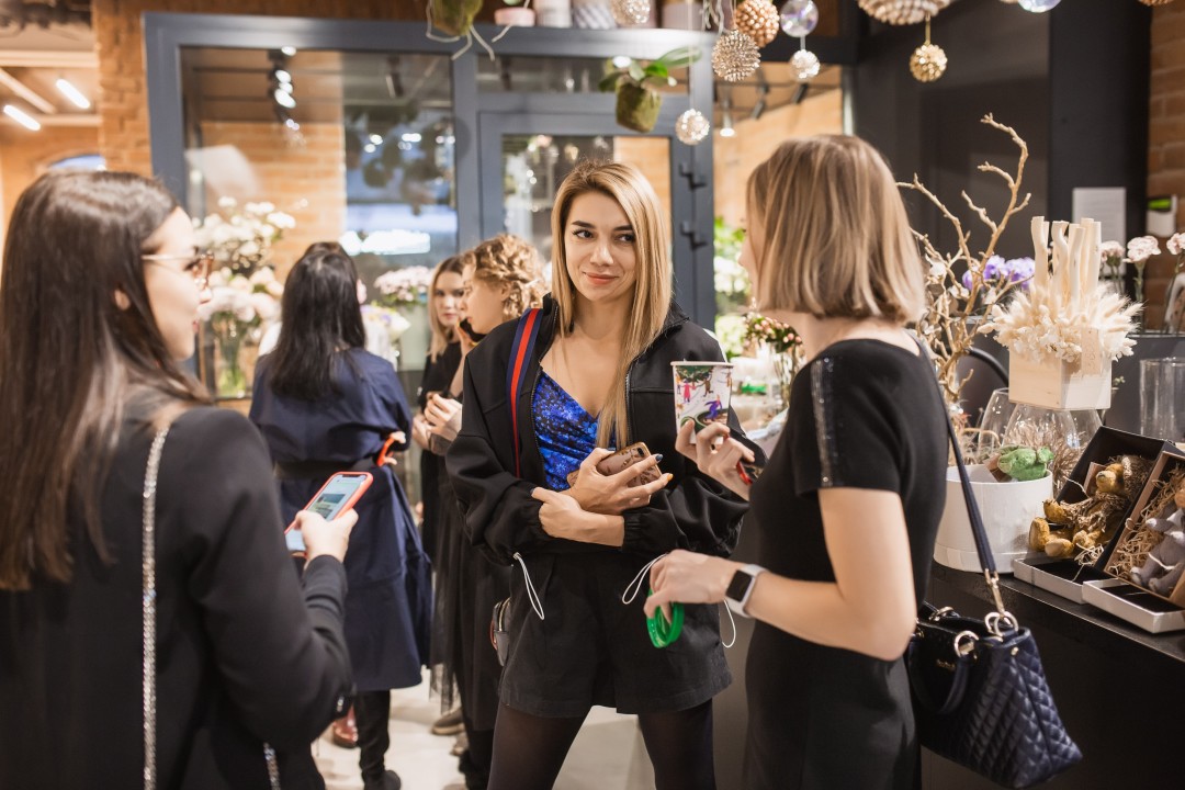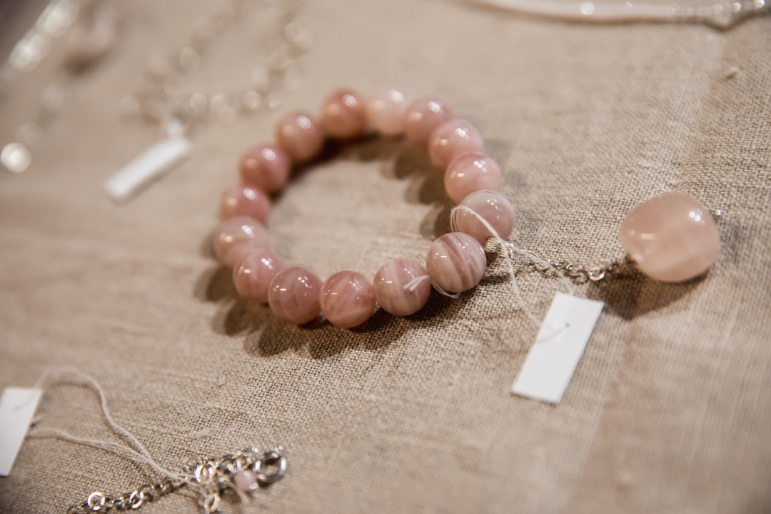 Авторскими аксессуарами Ирины Егоровой гости любовались в мастерской букетов «Веников не вяжем». Рассматривая изделия из розового кварца, серебра и барочного жемчуга, они угощались рождественским кофе от Kumpan Cafe.