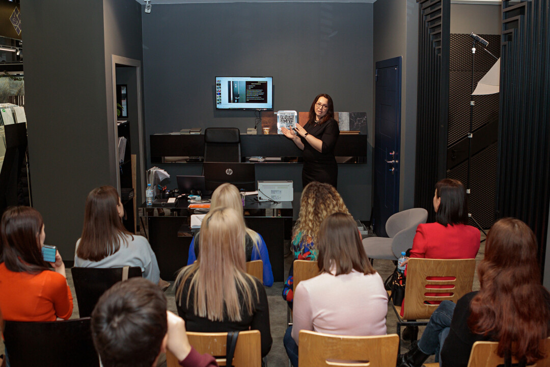 Бизнес-тренер фабрики Portalle Татьяна Мазурова рассказала гостям о бренде и новинках салона. Также на встрече обсудили способы и возможности сотрудничества дизайнеров и фабрики. Мероприятие завершилось розыгрышем призов и фуршетом.