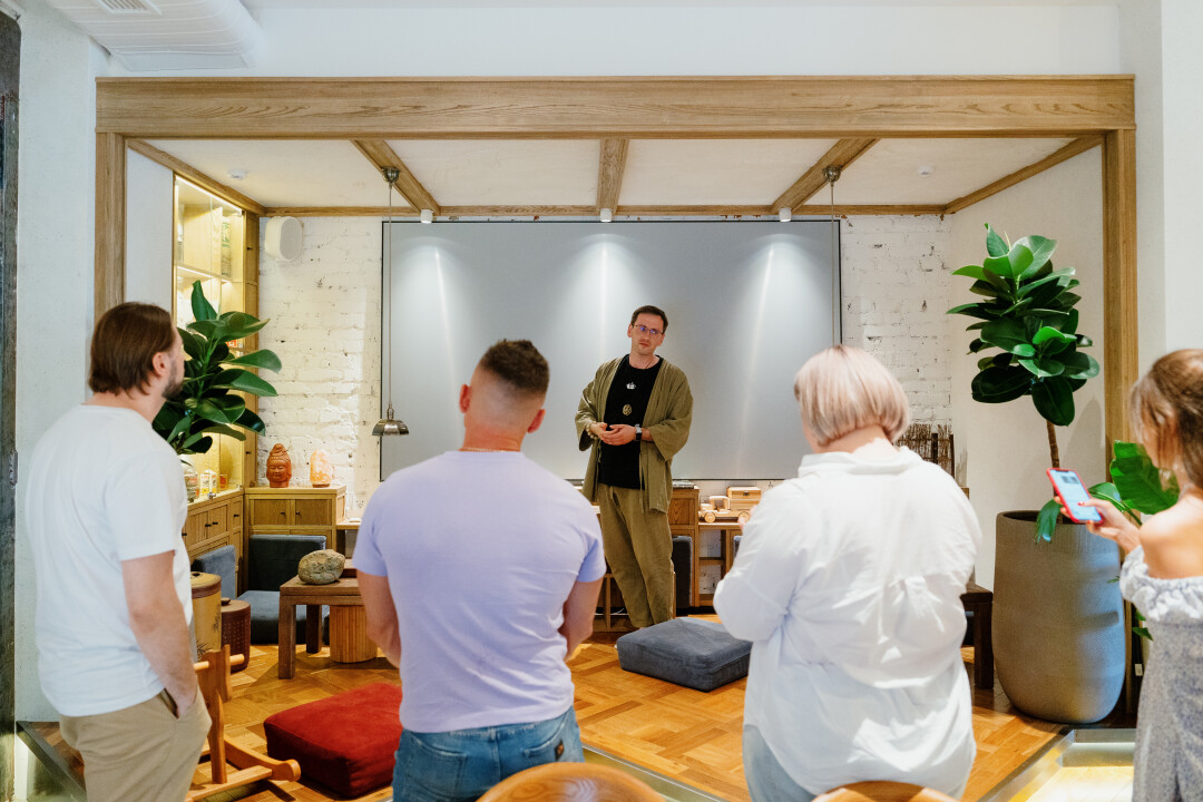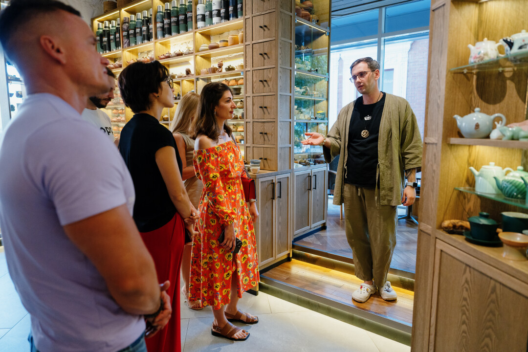 Гостям показали, как устроено пространство, рассказали, какие сорта чая тут можно приобрести. Чайный мастер провел церемонию, показал, как правильно заваривать напиток и на какие тонкости стоит обратить внимание.