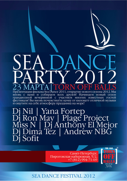 23 марта в баре Torn Off Balls — вечеринка по случаю выхода фильма «Sea Dance 2011». Sea Dance — музыкальный фестиваль, проходящий на курсирующем между Петербургом и Стокгольмом пароме «Принцесса Анастасия». За пульт в баре встанут гости фестиваля: Dj Nil, Yana Fortep, Dj Ron May, Plage Project, Miss N, Dj Anthony El Mejor, Dj Dima Tez, Andrew NBG, Dj Sofit.