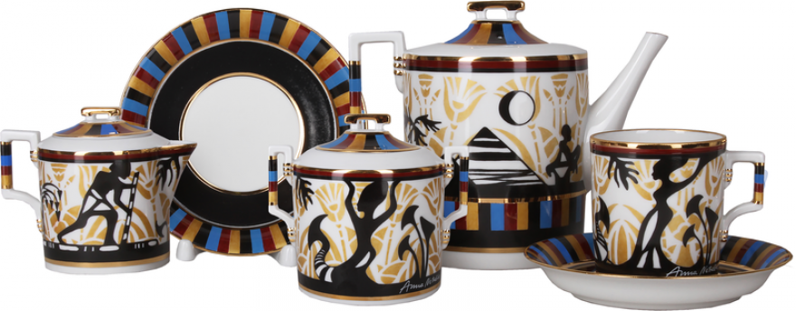 В эскизах Нетребко отразила собственное прочтение знаменитой оперы Джузеппе Верди «Аида». Коллекционный сервиз рассчитан на шесть персон и включает в себя чайник, сахарницу, молочник и шесть чашек с блюдцами.