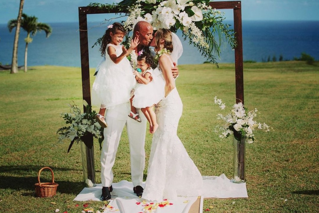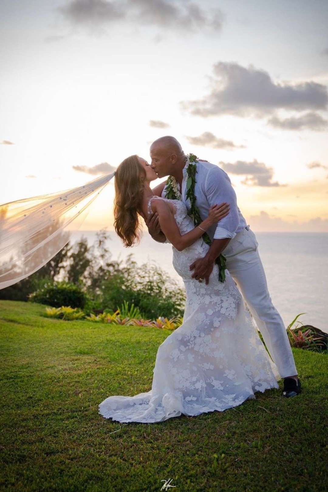 Если ваш бойфренд не делает предложение спустя пять лет отношений, не отчаивайтесь — супруга Дуэйна «Скалы» Джонсона Лорен Хашиан ждала кольца целых двенадцать! За это время у пары родилось двое дочерей, которые и стали главными гостями на августовской свадьбе: она прошла на Гавайских островах по всем традициях местных — от обмена клятвами на берегу океана до танцев в цветочных ожерельях «леи». У Дуэйна оно стилизовало льняную рубашку и белые брюки, у Лорен — платье типа «русалка» от Mira Zwillinger.